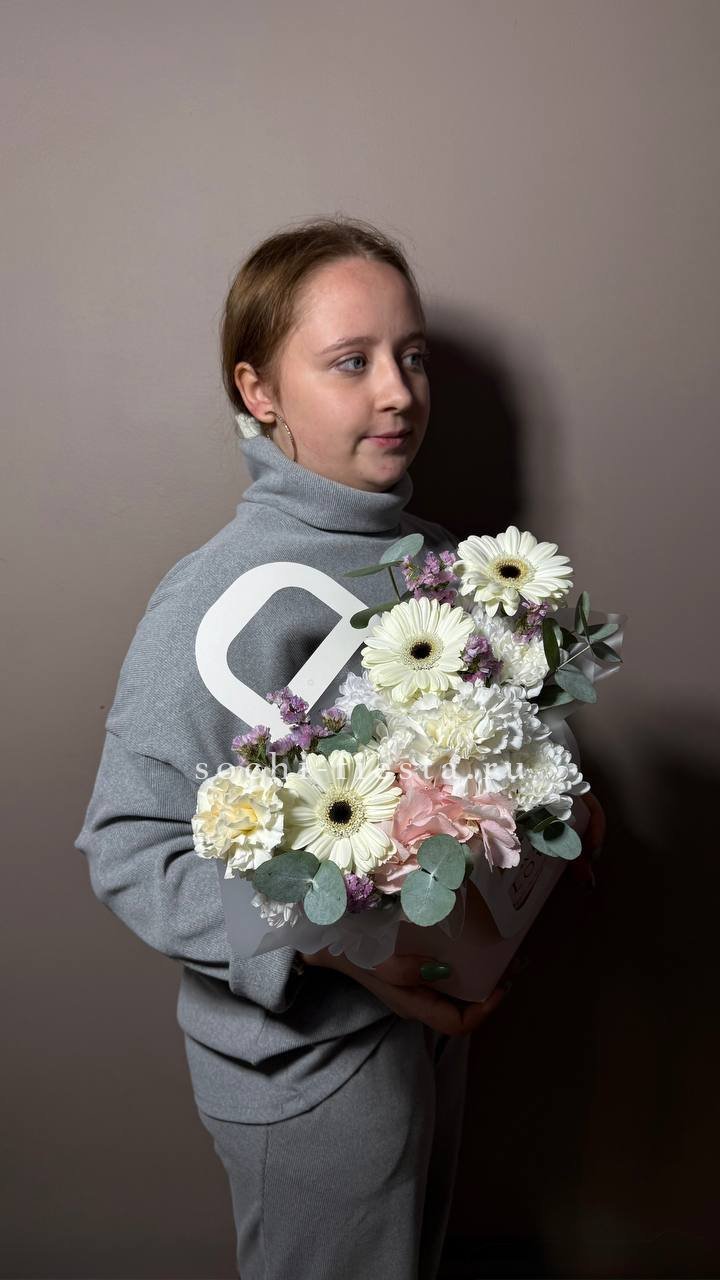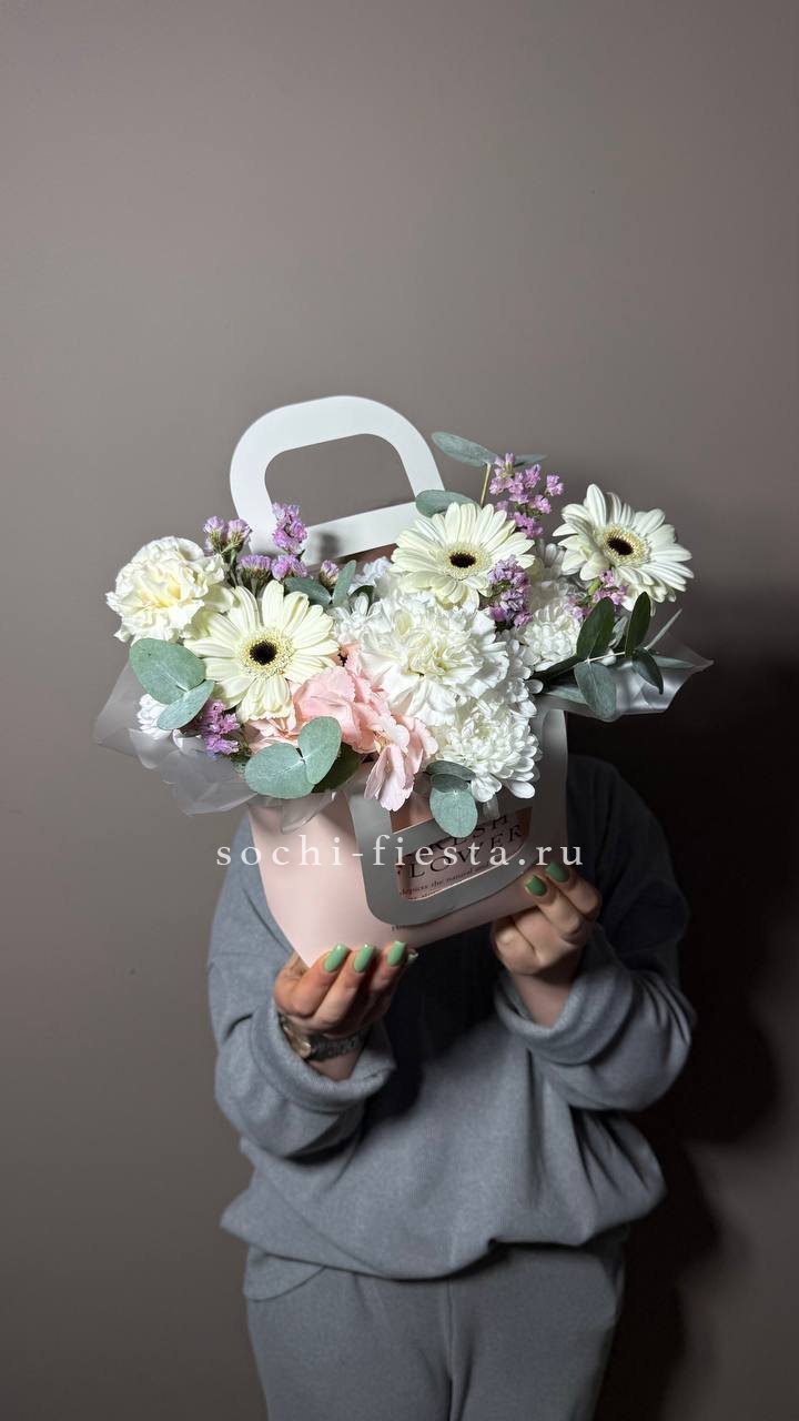Компактная сумочка с кустовыми хризантемами создаёт уютное настроение. Живые соцветия собраны в удобной форме, которая легко размещается на столе или полке.