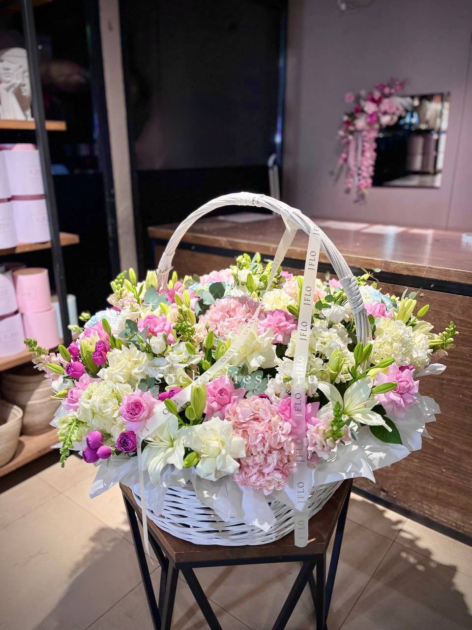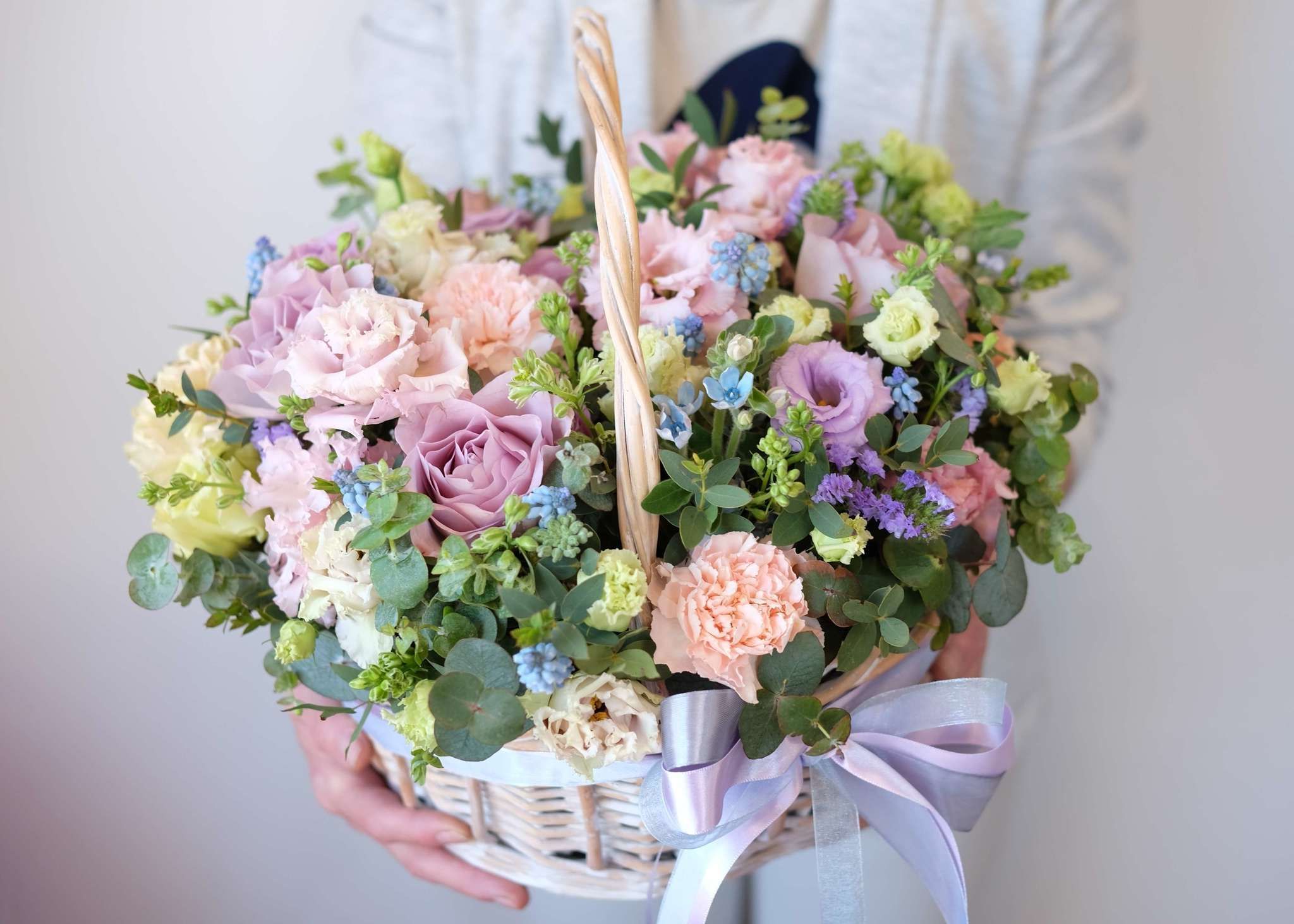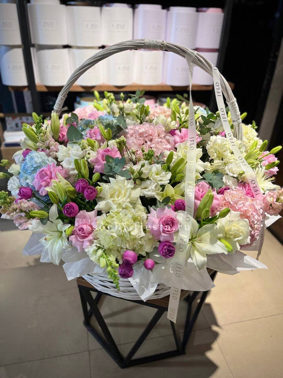 Пышная корзина с бархатными гортензиями и розами разных форм создает живописную композицию в романтичной гамме. Альстромерии и диантусы добавляют воздушности между крупными соцветиями.