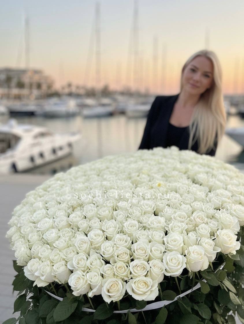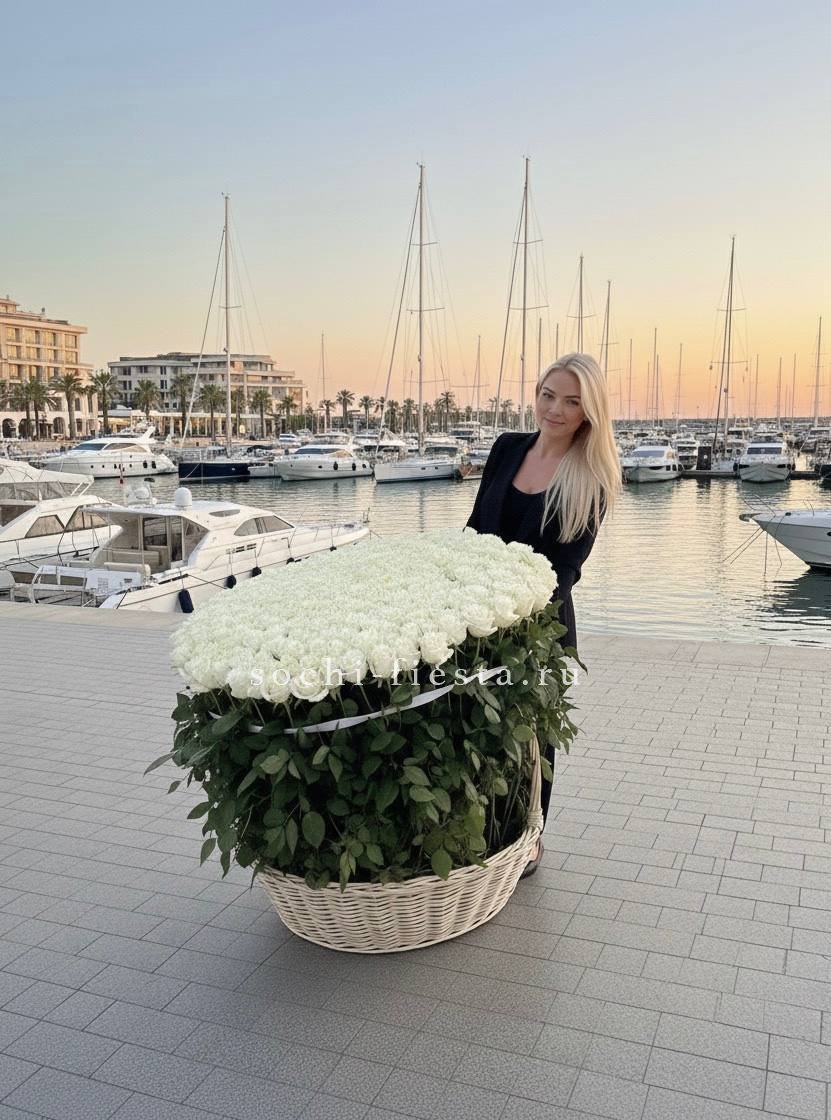 Триста одна белая роза в плетёной корзине образует живую скульптуру почти метровой высоты. Монохромная композиция завораживает масштабом и графичностью.
