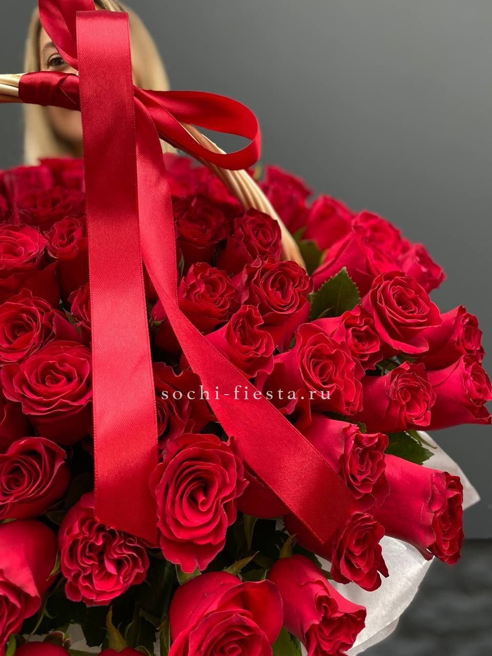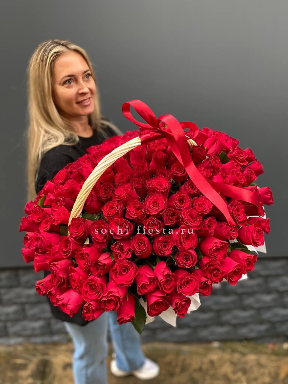 Пятьсот пять алых бутонов собраны в масштабную корзину, которая заполняет пространство цветом и объемом. Это композиция, которая говорит сама за себя своим количеством и насыщенностью.