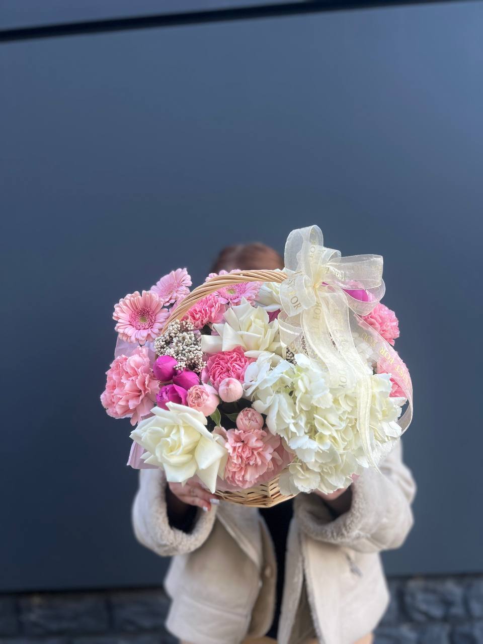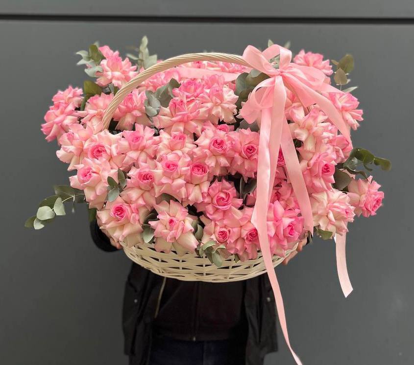 гортензия, эустома, пионовидная кустовая роза, розы одноголовые, диантусы, вспомогательная зелень, лента, корзина D45.