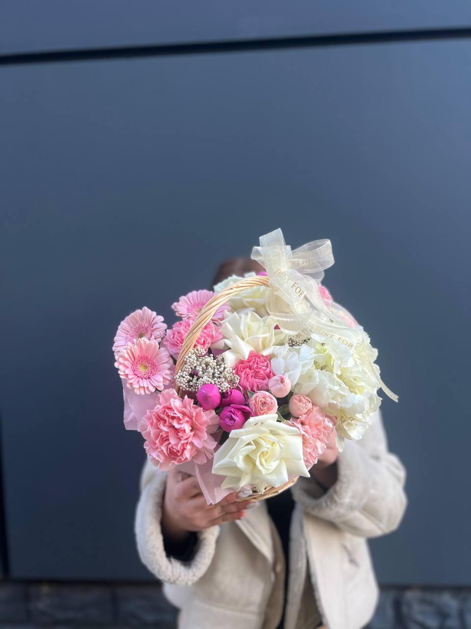 Широкая корзина вмещает пышную композицию из гортензий, эустом и пионовидных роз. Цветы располагаются свободно, создавая впечатление садовой клумбы, перенесенной в интерьер.