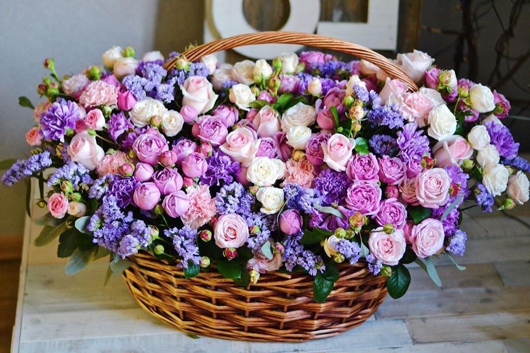 Пышная корзина с крупными бутонами роз, лилий и гортензий создаёт объёмную композицию с плавными переходами между соцветиями. Пионы добавляют воздушности и мягкости всей форме.