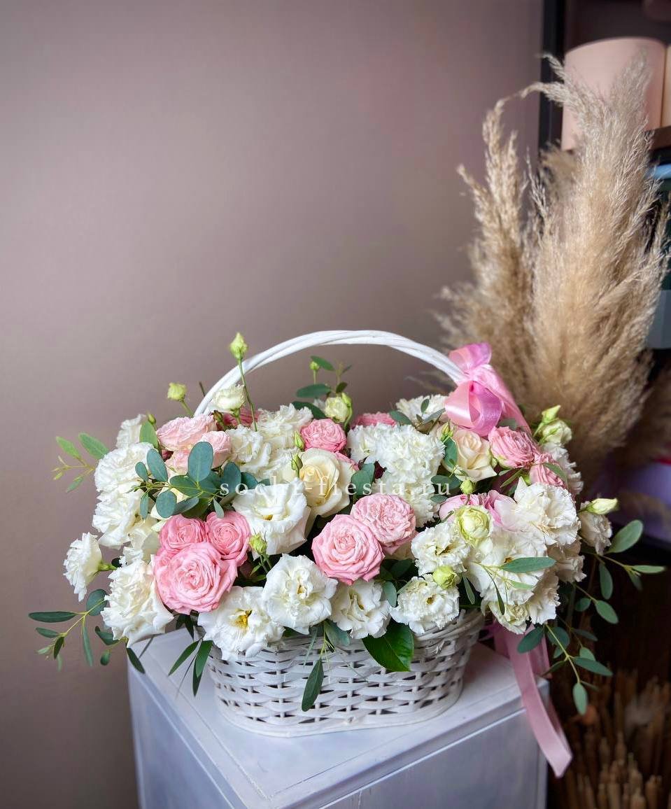 Пышная композиция в корзине собрана из роз двух видов и воздушной эустомы в бело-розовой гамме. Фисташка добавляет свежести, а округлая форма создает ощущение наполненности и объема.