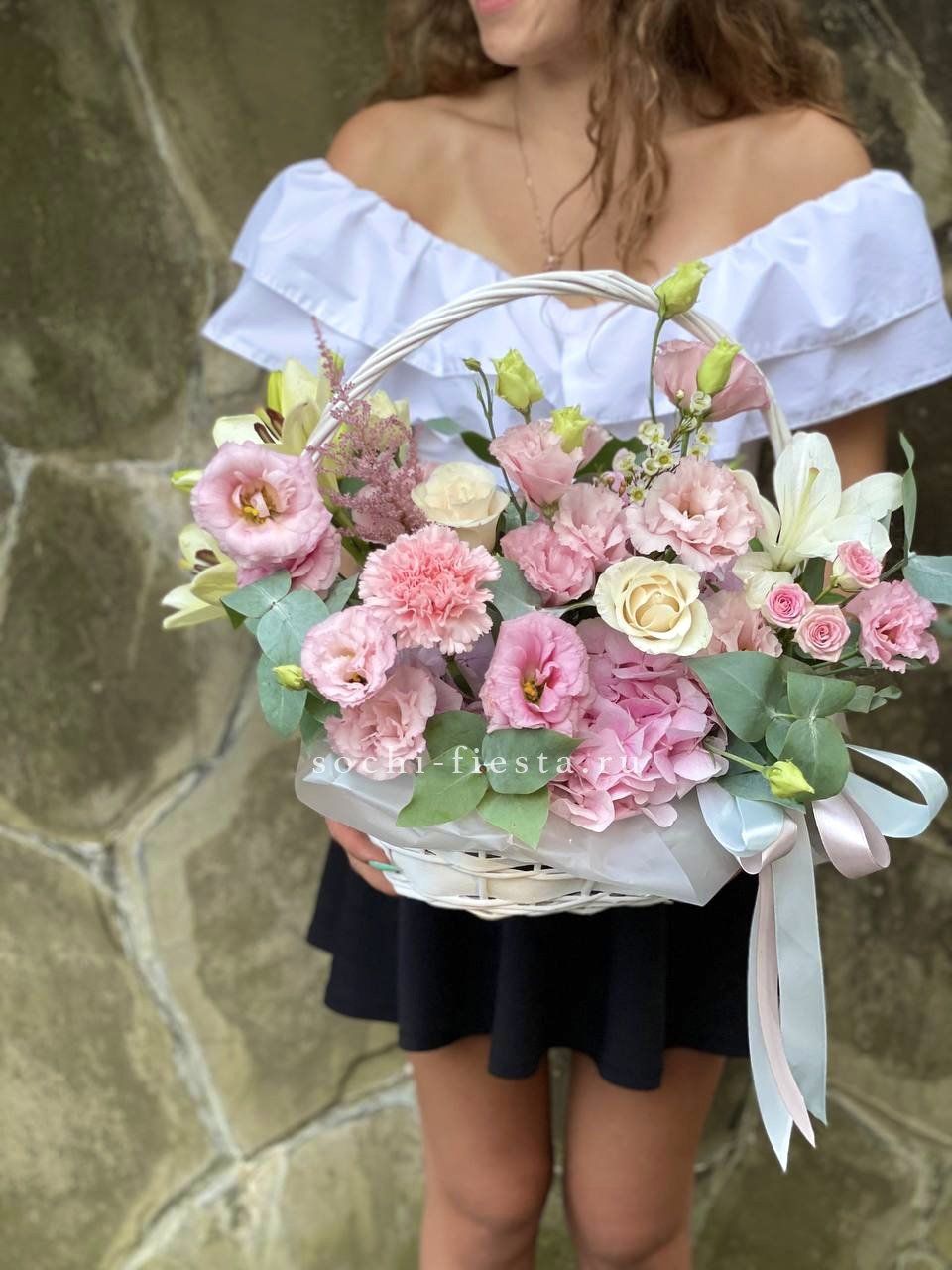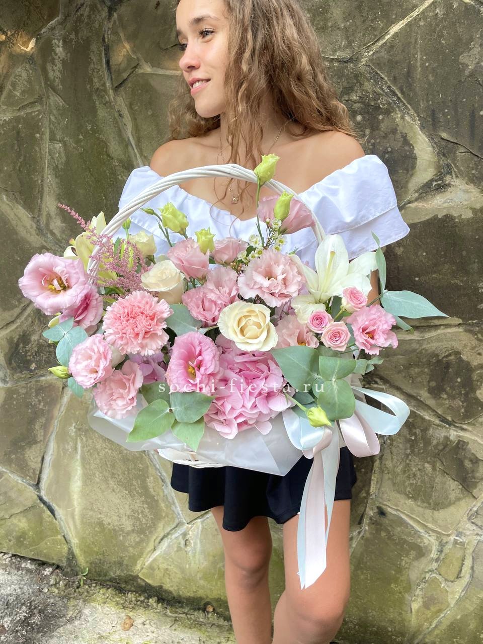 Пышная корзина объединяет пионовидные розы с воздушной гортензией и многослойной эустомой. Матиолла и лимониум добавляют глубину композиции, а диантус создает мягкие переходы между крупными бутонами.