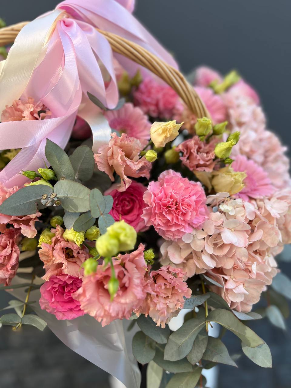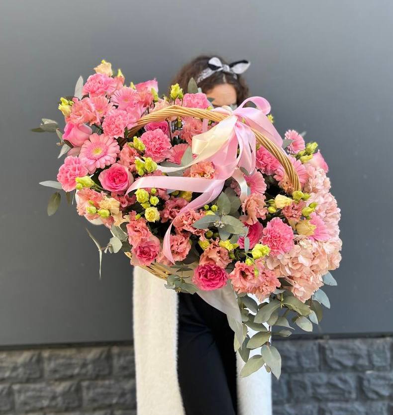 Двадцать пять французских роз в корзине создают плавный переход от светлых розовых тонов к насыщенной фуксии. Эвкалипт добавляет свежести и завершает композицию естественной зеленью. Букет удобно разместить на столе или комоде благодаря устойчивой корзине.