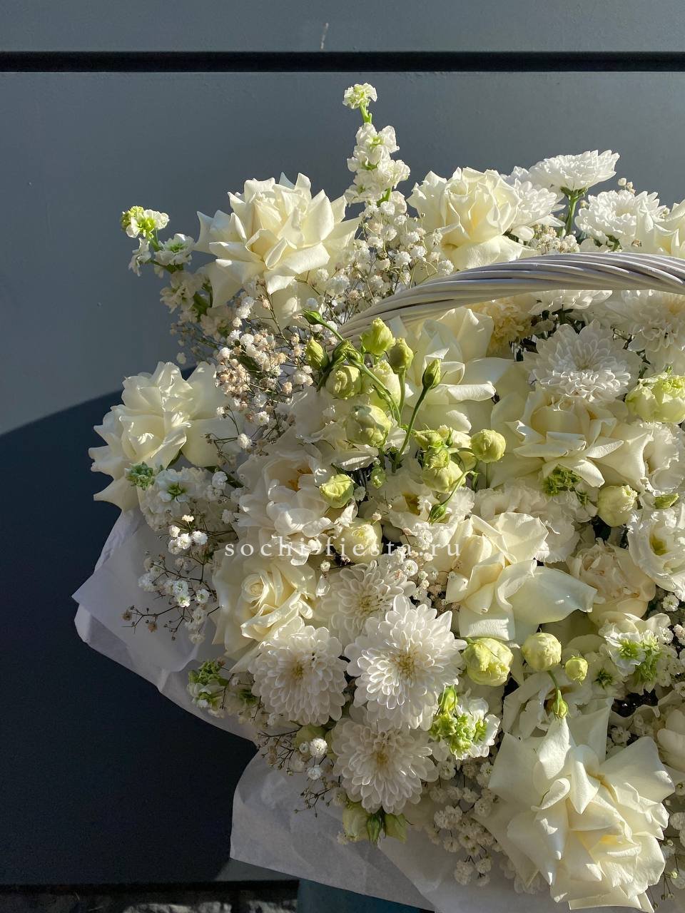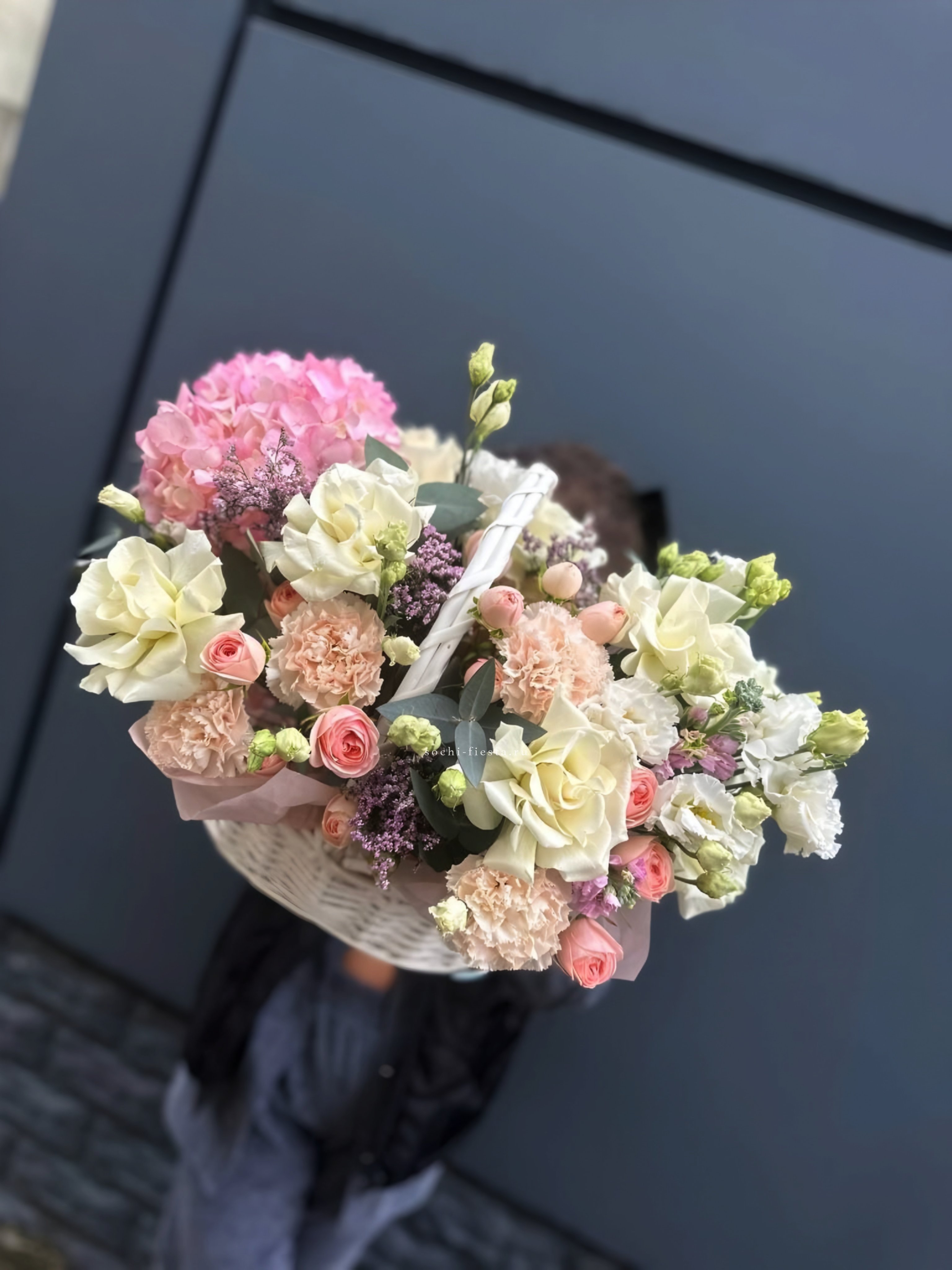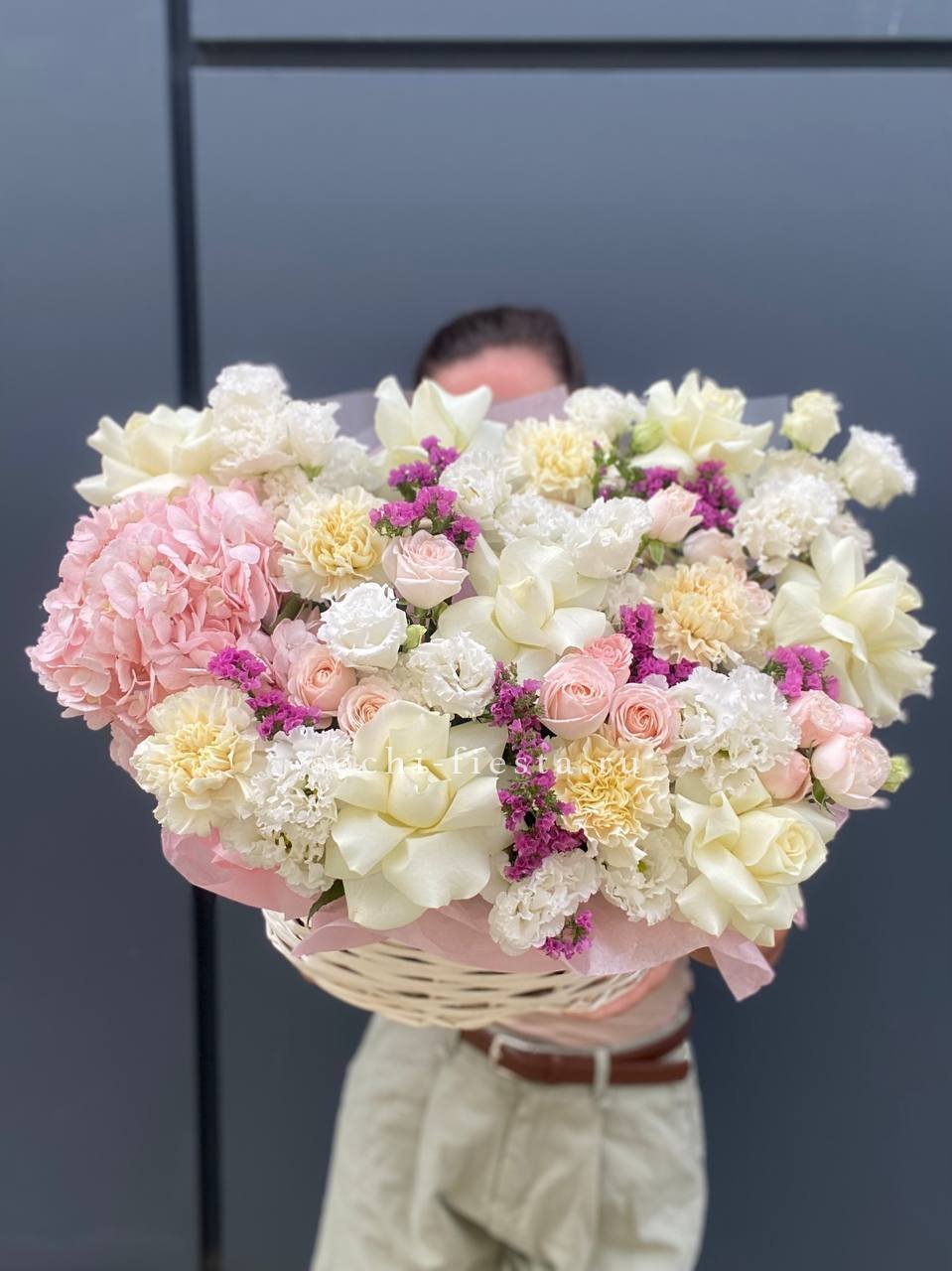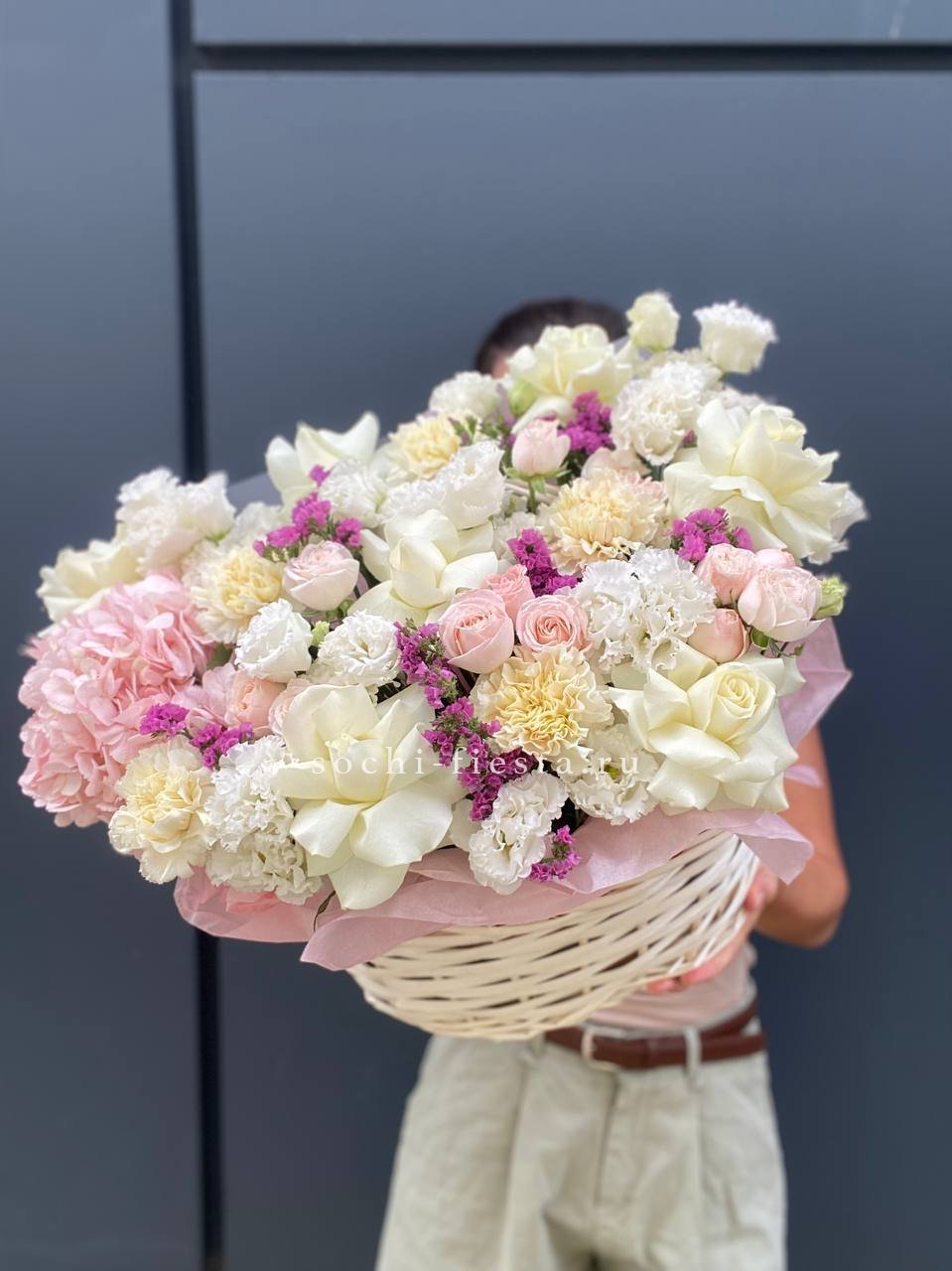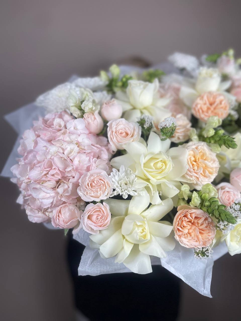 Плетёная корзина вмещает густую композицию из белых и розовых бутонов. Хризантемы и розы перемежаются с соцветиями гортензии, а статица добавляет воздушности между крупными головками цветов.