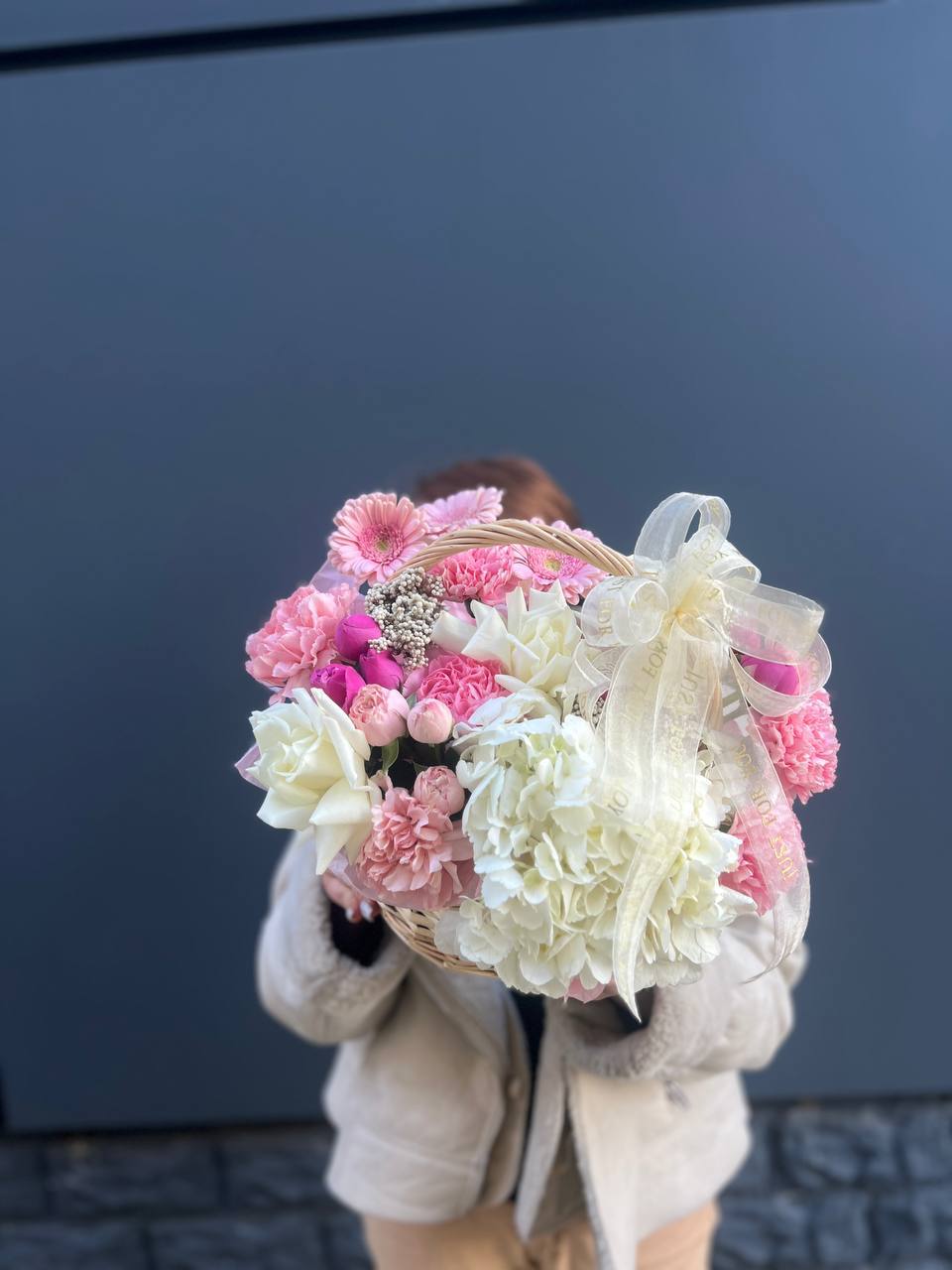 герберы, рзовая роза, диантус, озотамус, мисти баблс, бомбастиу, корзина малая.