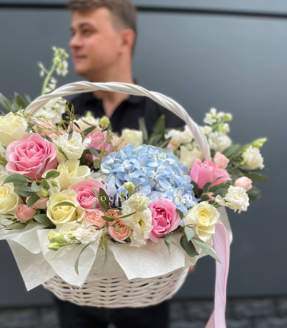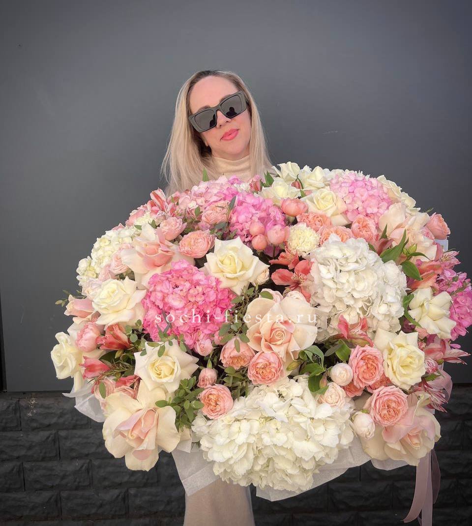 Здесь идеально сочетаются крупные, бархатистые бутоны роз, облака гортензии и мелкие акцентные цветы. Получилась невероятно воздушная и легкая композиция, которая мгновенно создает ощущение праздника и весеннего настроения. Стильный бант завершает этот изысканный образ.