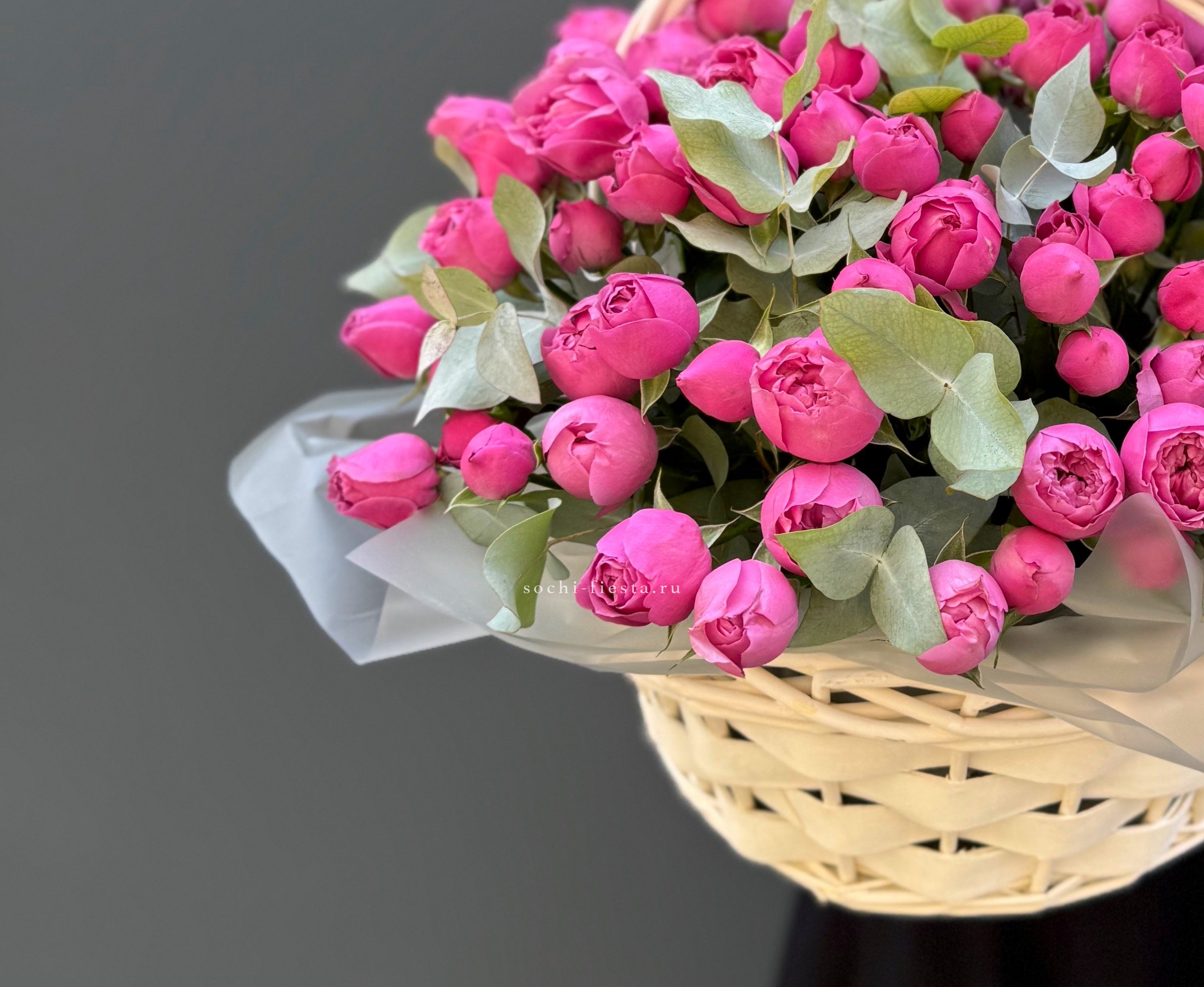 41 пионовидная кустовая роза Misty Bubbles, эвкалипт, светлая корзина.