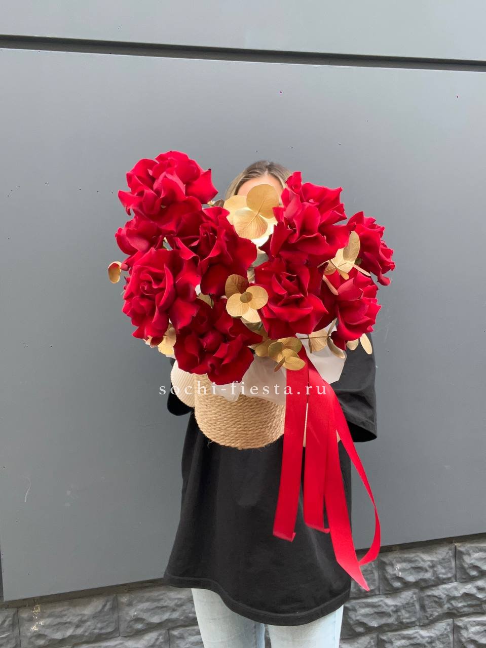 Сорок пять красных роз в высоком цилиндре создают впечатляющее присутствие. Плотная сборка держит форму, эвкалипт добавляет зелени по краю.