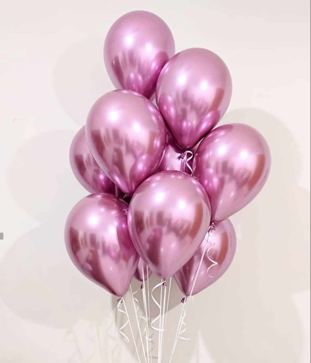 Девять хромированных шаров в розовом цвете собраны в лаконичную композицию. Обработка Highfloat продлевает время полета и сохраняет безупречную форму каждого шара.
