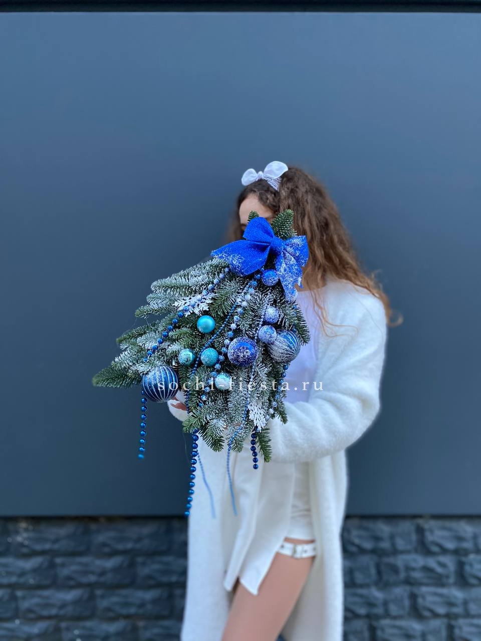 Пушистые ветви датского нобилиса собраны в плотную форму конуса и украшены россыпью бус с праздничными игрушками. Композиция держит силуэт и наполняет комнату свежим хвойным ароматом.