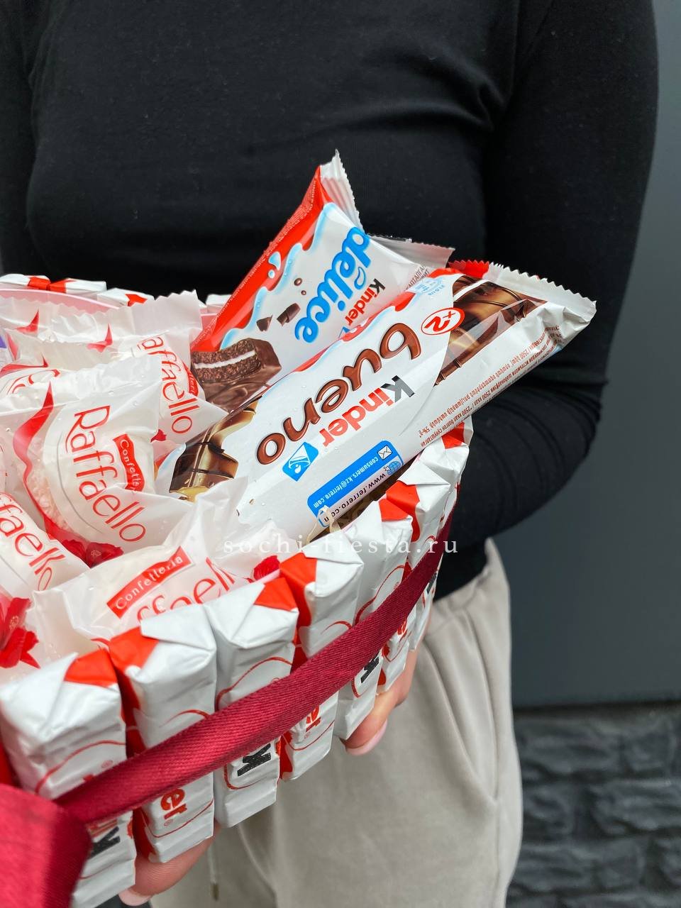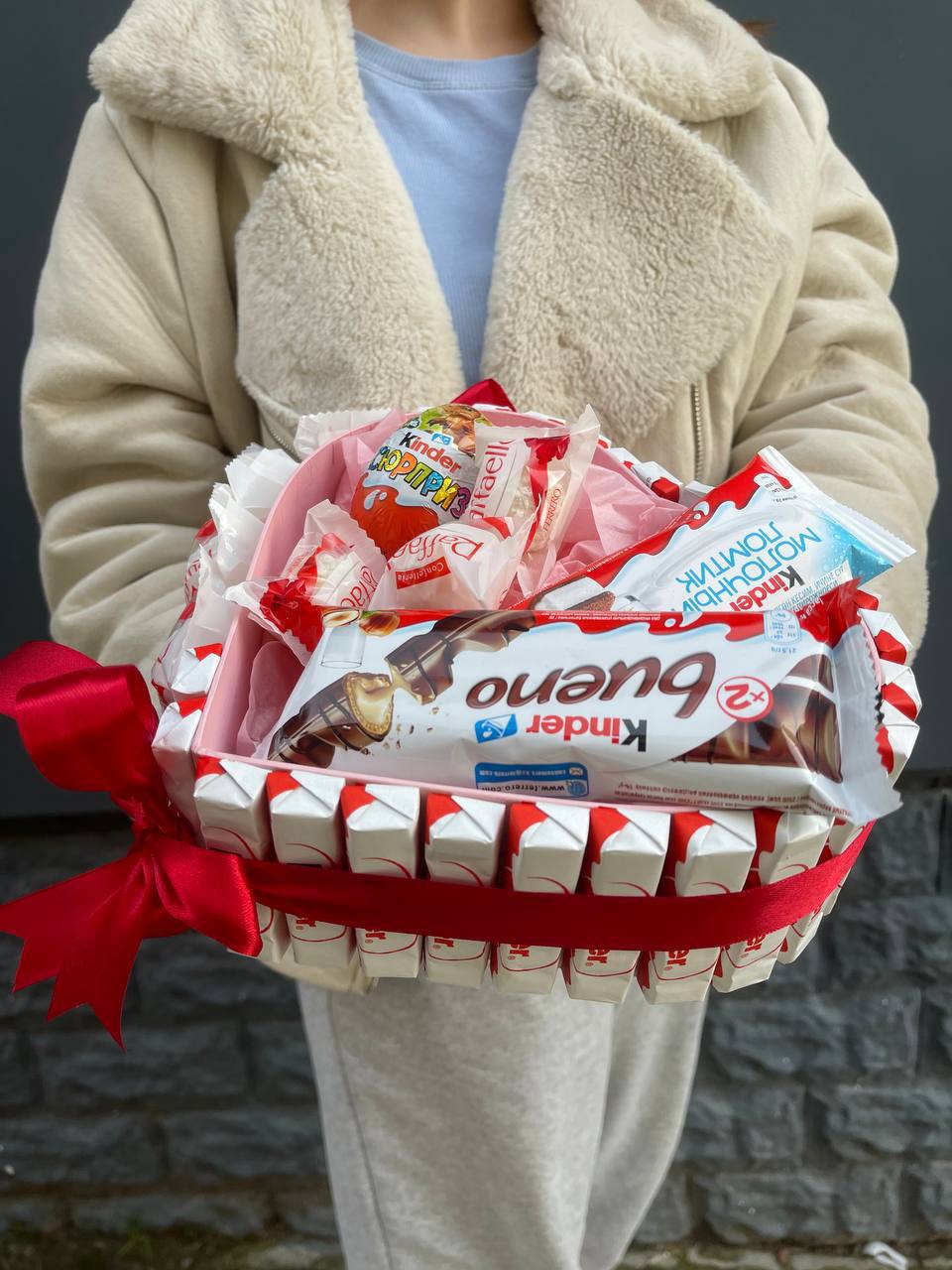 Коробка в форме сердца собрала внутри Рафаэлло, шоколадные батончики Bueno, хрустящий Delice и классический Киндер. Всё уложено так, чтобы сразу захотелось открыть и попробовать. Готовое решение для сладкого сюрприза.