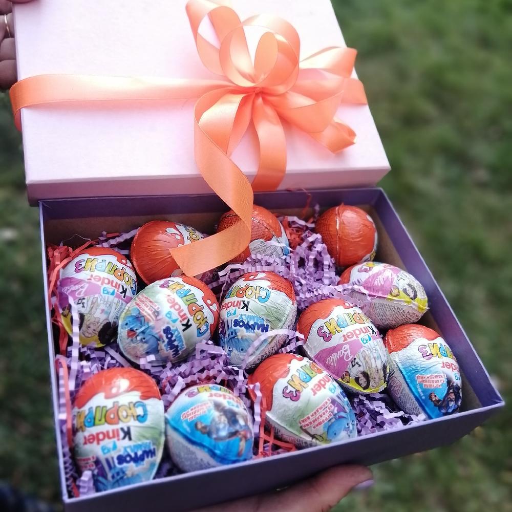 Коробка в форме сердца собрана из популярных сладостей Kinder. Внутри шоколадные батончики, нежные ломтики и яйца с сюрпризом создают яркую композицию для тех, кто ценит проверенные вкусы.