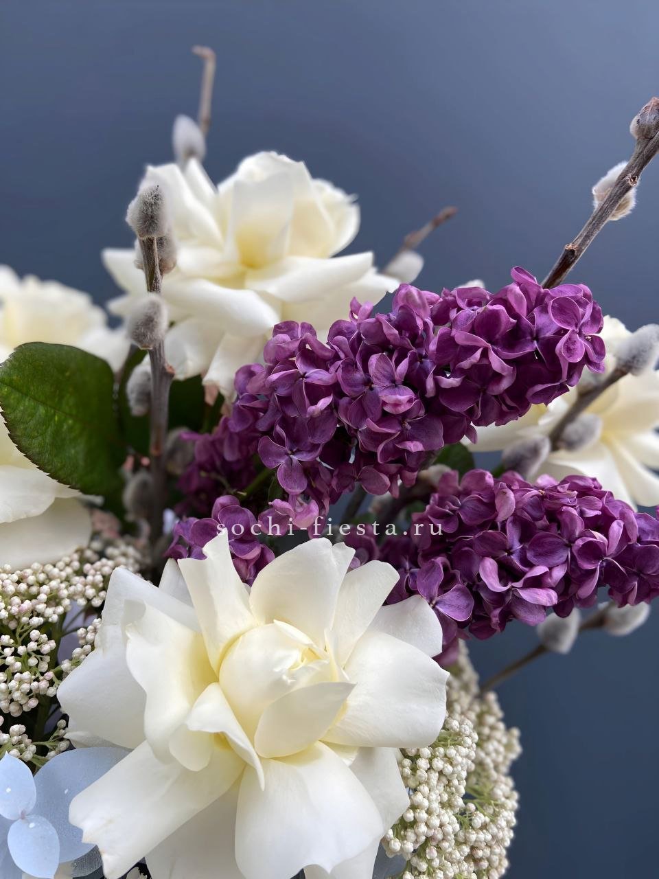 Весенняя композиция объединяет пушистые ветви вербы с бутонами белых роз и соцветиями сирени. Диантусы и озотамнус создают объёмную текстуру, а сама форма бокса делает композицию устойчивой и завершённой. Подходит для светлых праздников и семейных встреч.