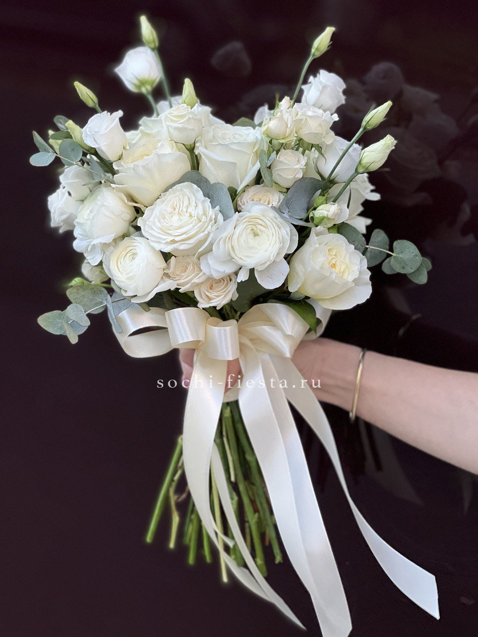 кустовые пионовидные розы Бомбастик, одноголовая пионовидная роза (или замена вне сезона на кустовую пионовидную), диантусы, эвкалипт, лента.
