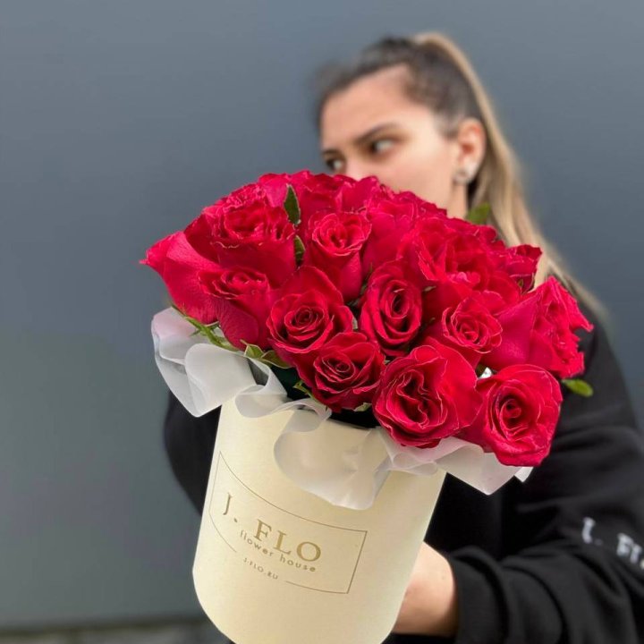 Шляпные коробки с розами — удобный подарочный формат. Флористическая губка внутри держит влагу, композиция стоит на столе 5-7 дней без пересадки в вазу. Популярный выбор на дни рождения коллег, выписку из роддома, юбилей родителей.