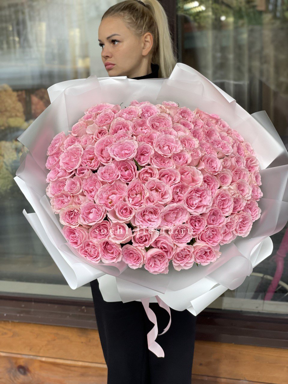 Сто один бутон в бело-розовой палитре создают объёмное облако цвета. Композиция впечатляет масштабом и наполняет пространство мягким сиянием лепестков.