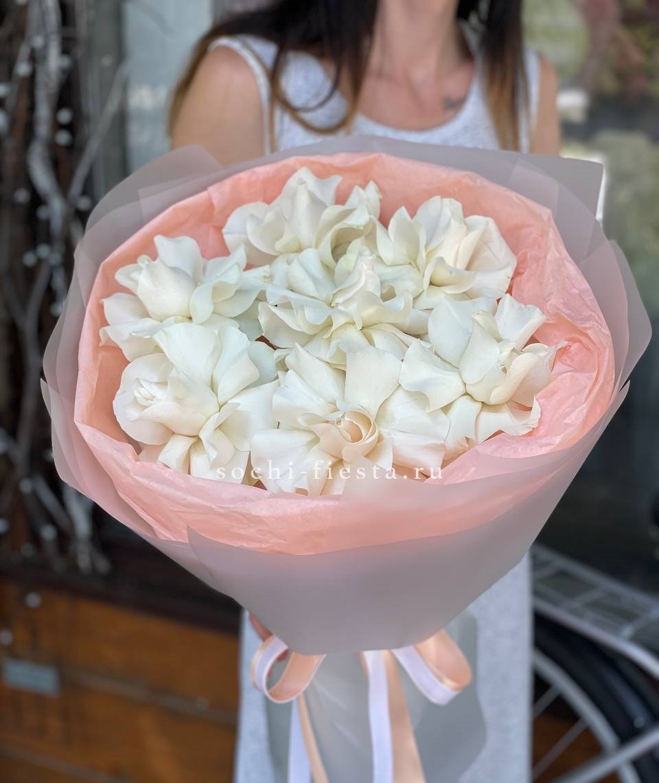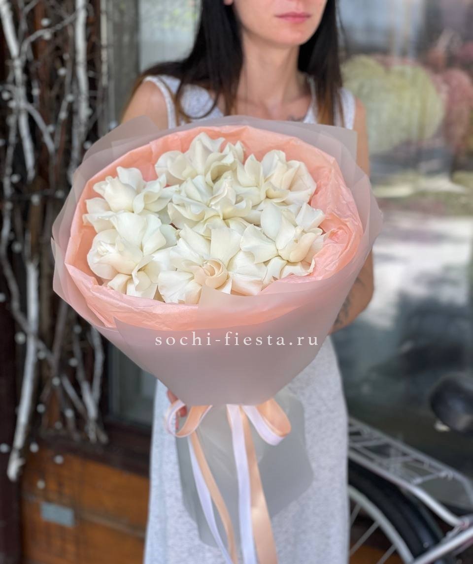 Белоснежные лепестки создают ощущение света и простора. Двадцать один бутон образует воздушную композицию с мягким переходом оттенков. Букет дарит момент тишины и покоя.