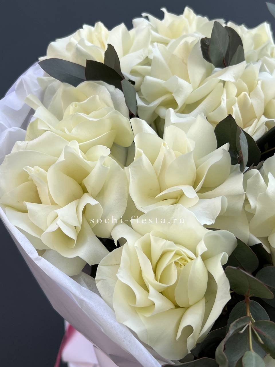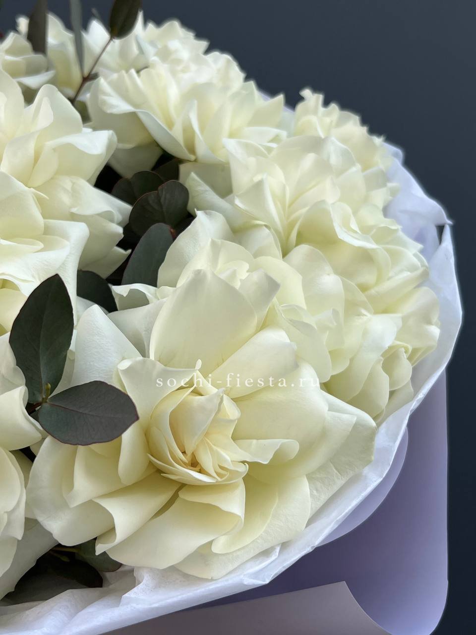 Двадцать пять вывернутых бутонов формируют объемную композицию с выразительным присутствием. Белые лепестки и зелень эвкалипта создают ощущение простора и легкости.