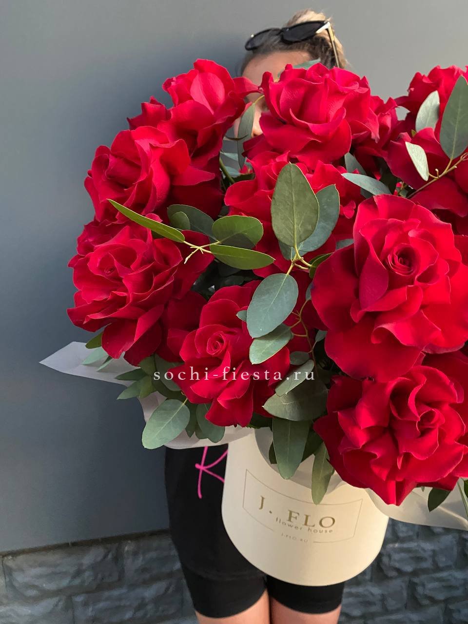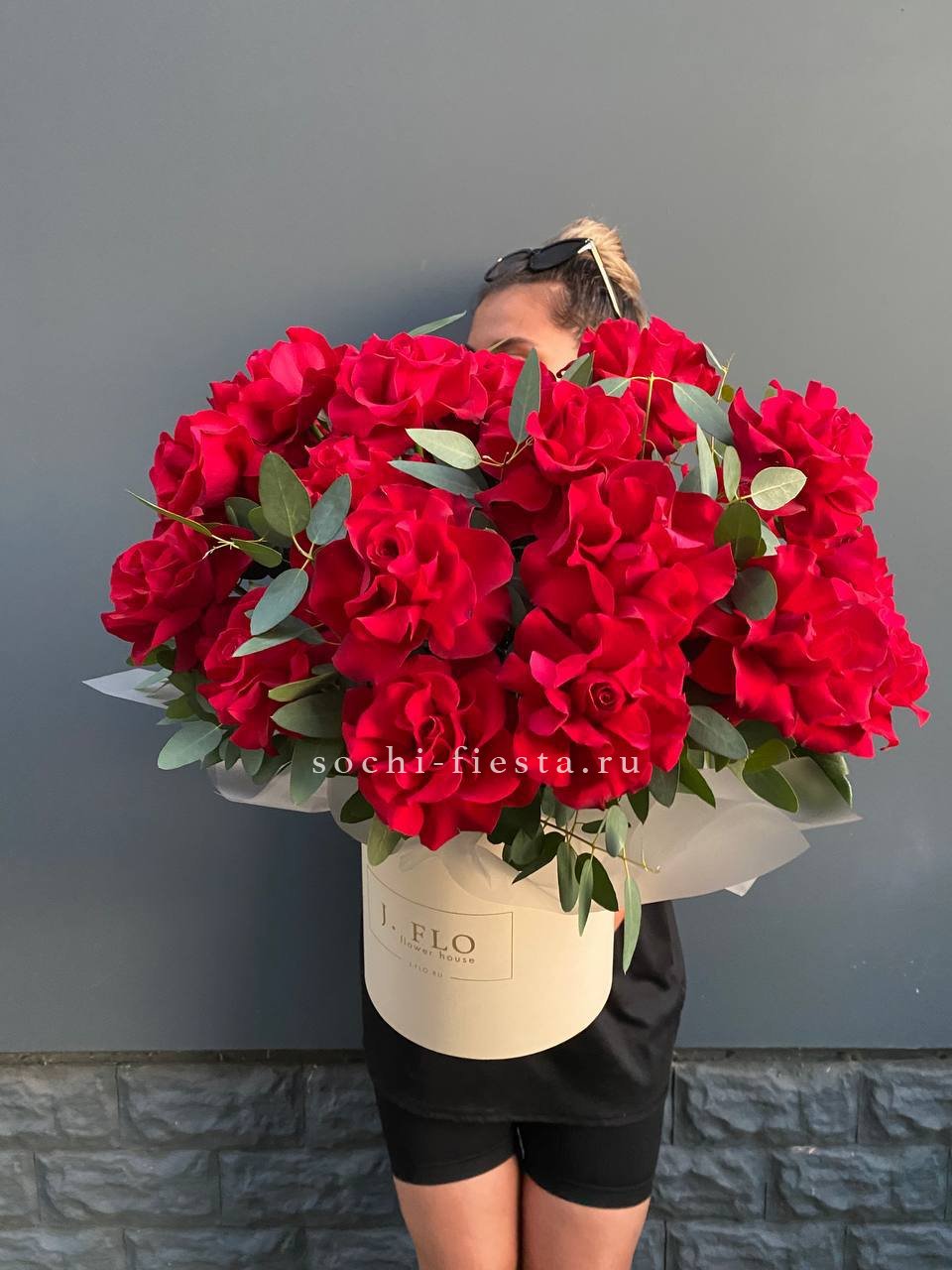 Красные розы в обрамлении чёрного материала — это игра света и тени в одном букете. Тёмный фон усиливает яркость алых лепестков и добавляет композиции графичности.
