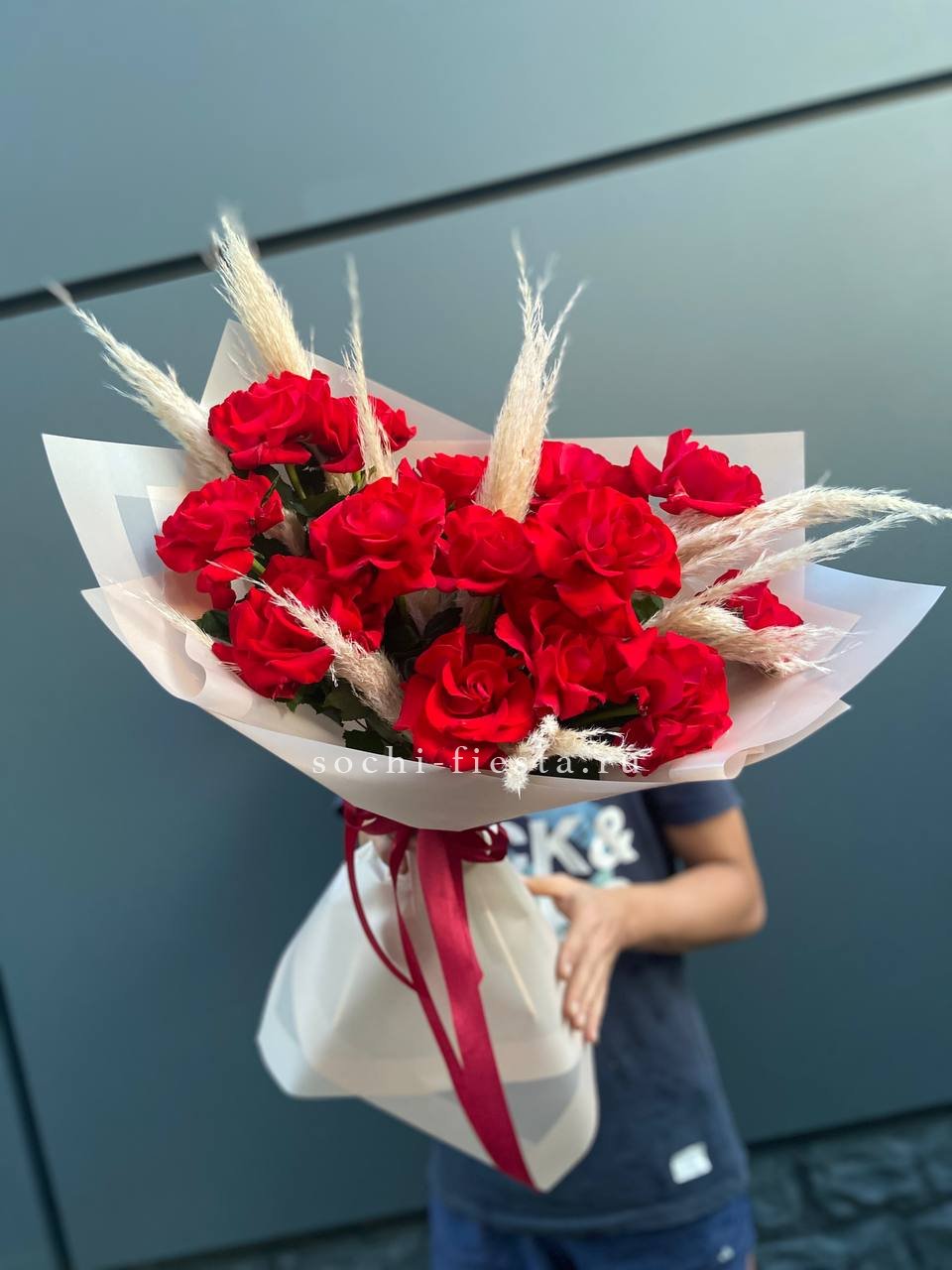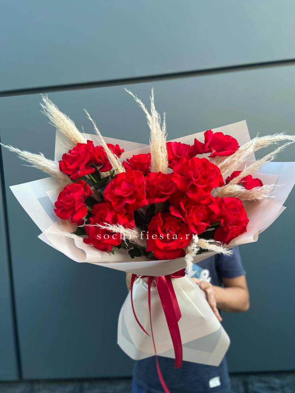 Сто одна голландская роза образует монументальную композицию. Красные бутоны выстраиваются в плотный объем, который невозможно не заметить и сложно забыть.