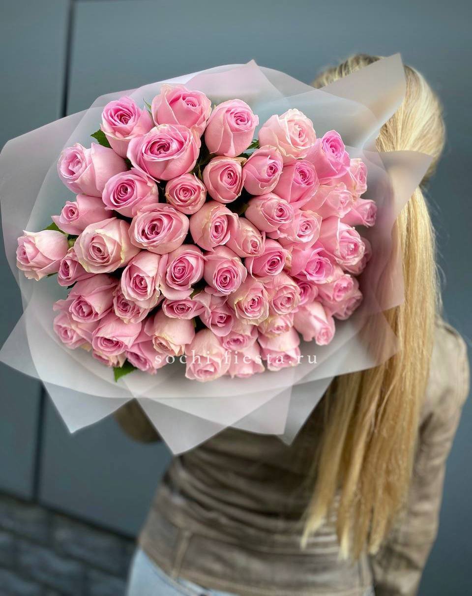 Пятьдесят один бутон формирует роскошную композицию насыщенного розового цвета. Авторское оформление придает букету завершенность. Такой масштаб производит яркое впечатление с первого взгляда.