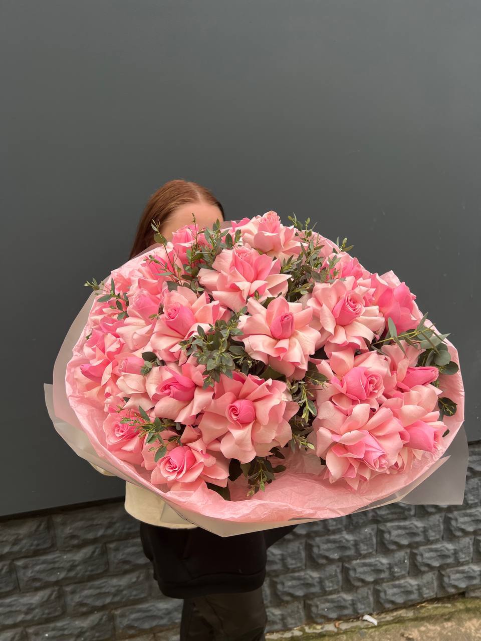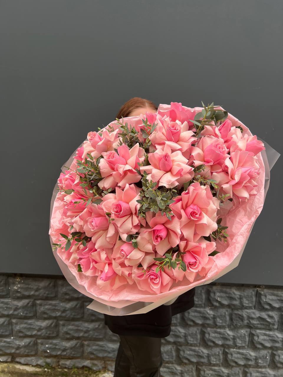 Французские розы Wendi с их фирменным пудровым оттенком раскрываются плавно и объемно. Эвкалипт добавляет воздуха между бутонами и создает естественную глубину композиции.
