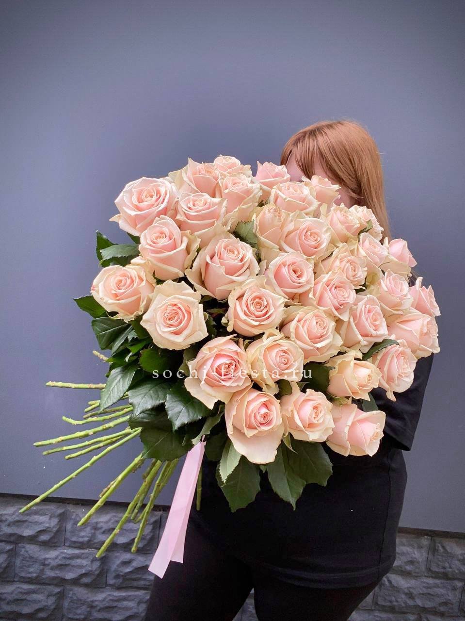 Тридцать пять роз на длинных стеблях образуют впечатляющую вертикальную композицию. Кремовый тон лепестков добавляет воздушности и света.