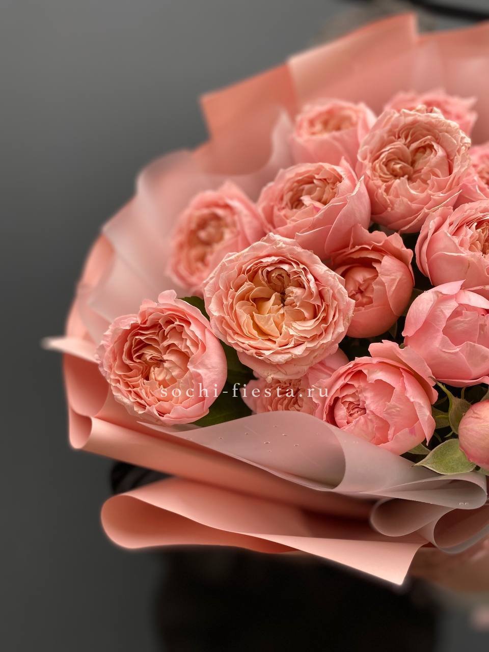 Пять веток кустовой розы Джульетта в лаконичной сборке. Каждая ветвь раскрывается несколькими бутонами теплого персикового оттенка. Компактный формат для быстрого знака внимания.