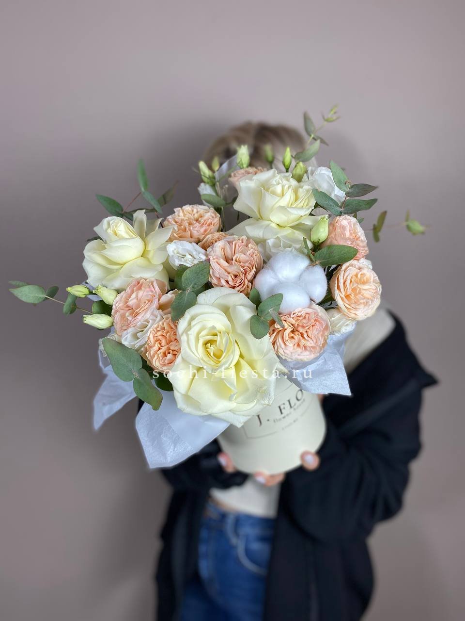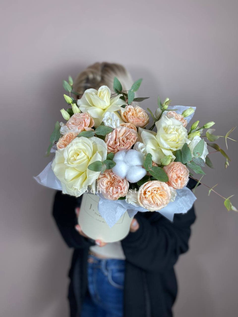 Мисти Баблс раскрывается пышными головками с множеством лепестков нежного персикового оттенка. Пионовидная форма добавляет глубину и объем каждому бутону в авторской сборке.