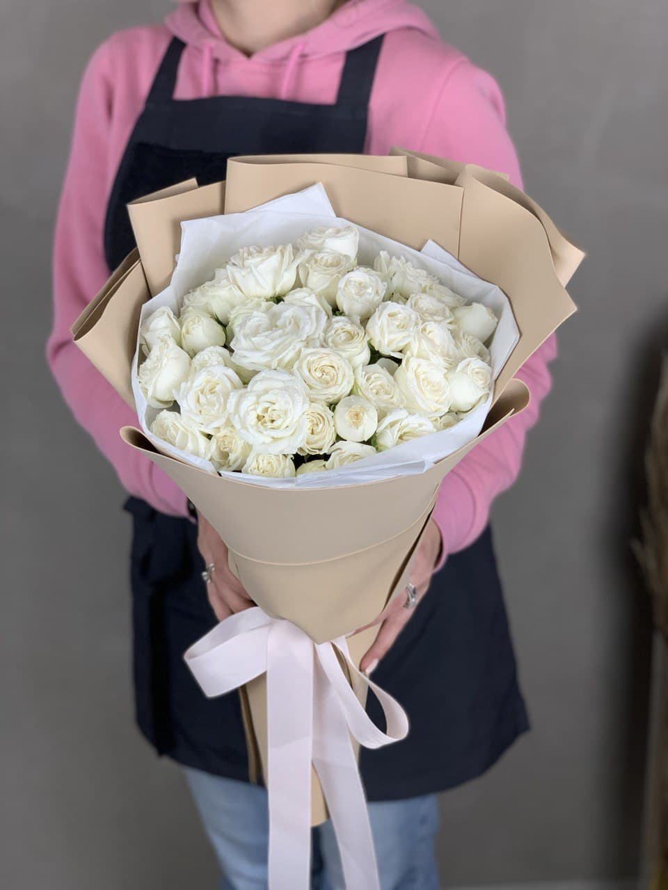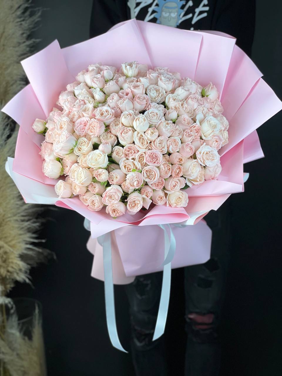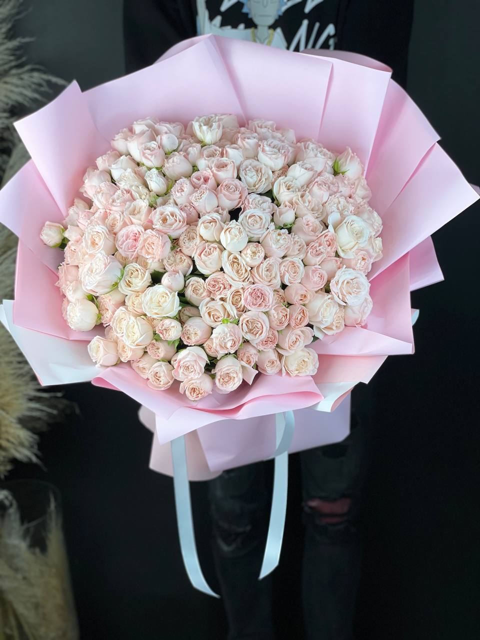 Минимальный состав: 35 пионовидных кустовых роз Мисти бабблс, лента, авторское оформление.