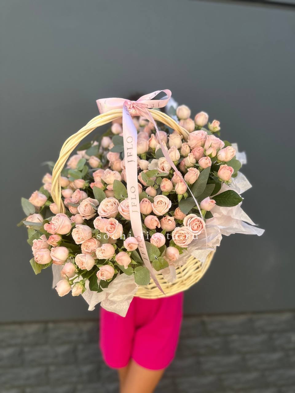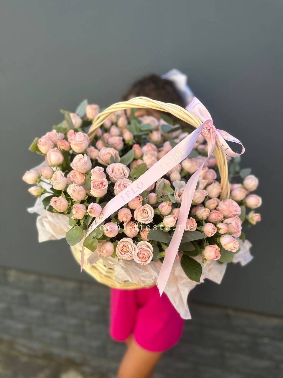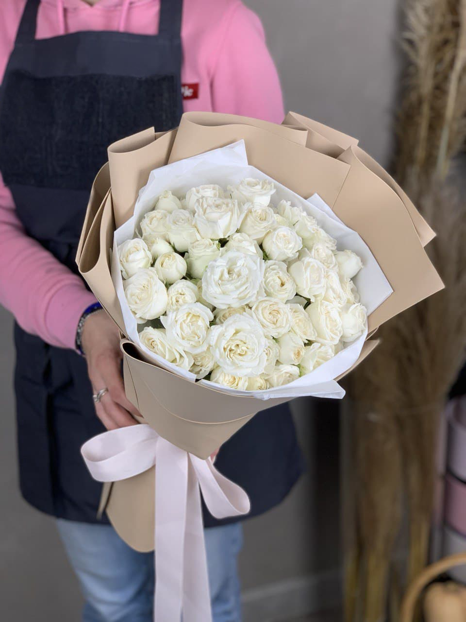 Минимальный состав: 35 пионовидных кустовых роз Мисти бабблс, лента, авторское оформление.