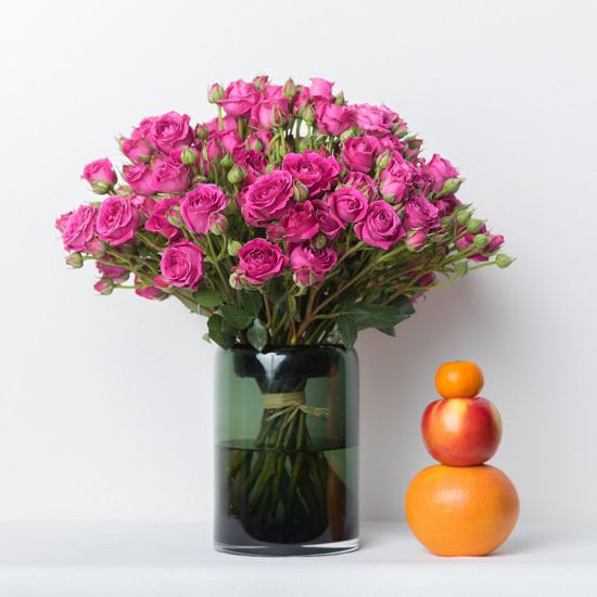 Пятнадцать кустовых роз собраны в плотную округлую форму. Мелкие бутоны создают воздушную текстуру и мягкий объём в пространстве.