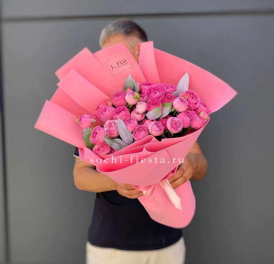 розы пионовидные 21шт, эвкалипт, пленка, лента.