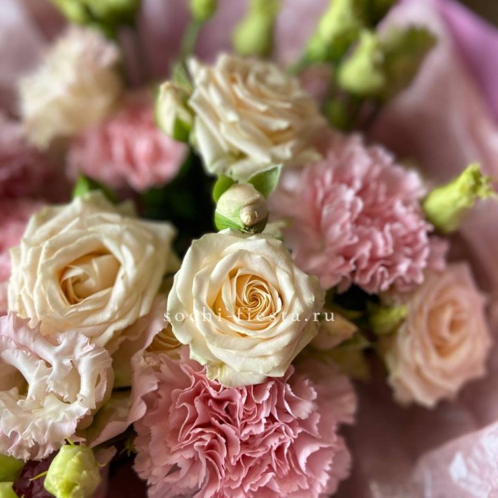 Основа сборных букетов в Костроме: розы (Freedom, Mondial, Avalanche), хризантема кустовая, альстромерия, эустома, фрезия, вероника. Дополнительно — ранункулюсы в сезон, хризантема одиночная, ирис весной, тюльпаны в апреле. Состав зависит от текущей поставки и сезона. Флорист всегда предлагает то, что в лучшей форме прямо сейчас.