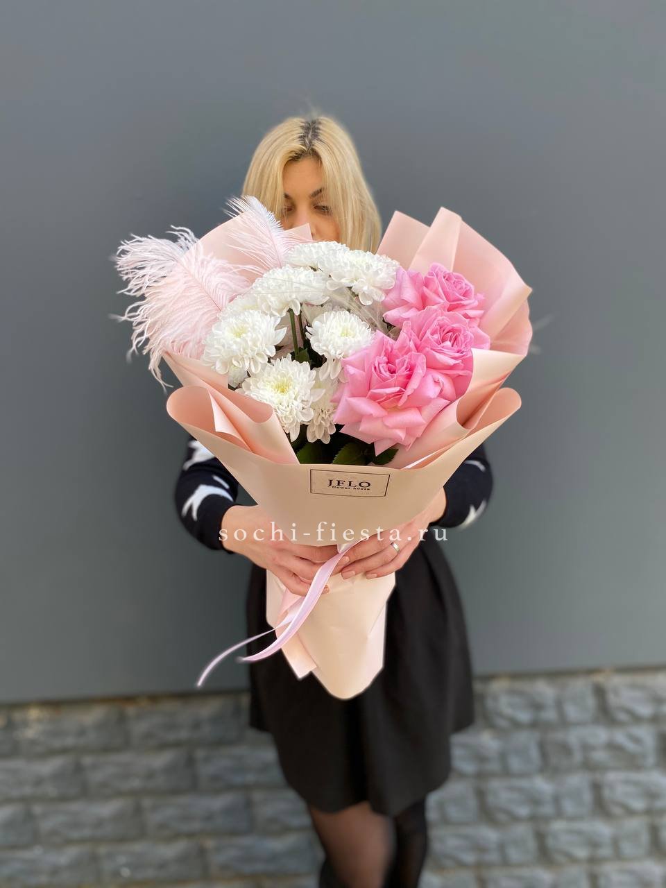 маттиола, розы, гортензия, диантусы, хризантемы , лента и дизайнерская пленка.