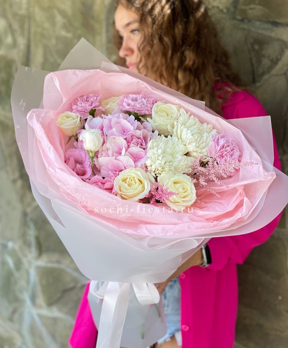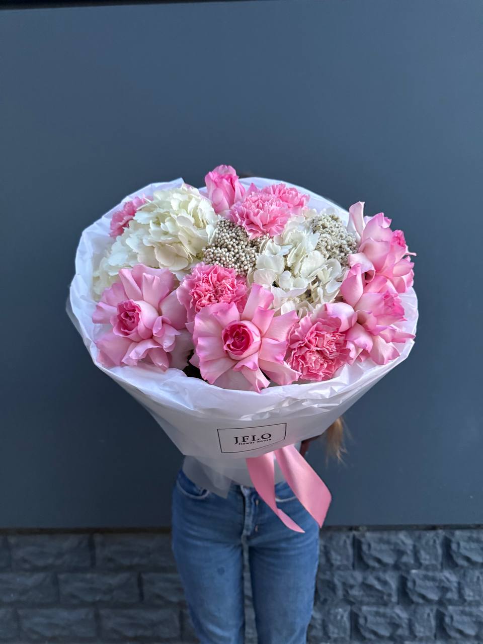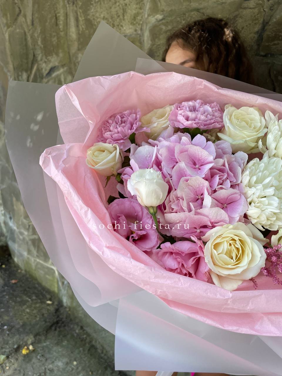 гортензия, розовые розы, диантусы, эустома, маттиолы, эвкалипт лента и дизайнерская пленка.