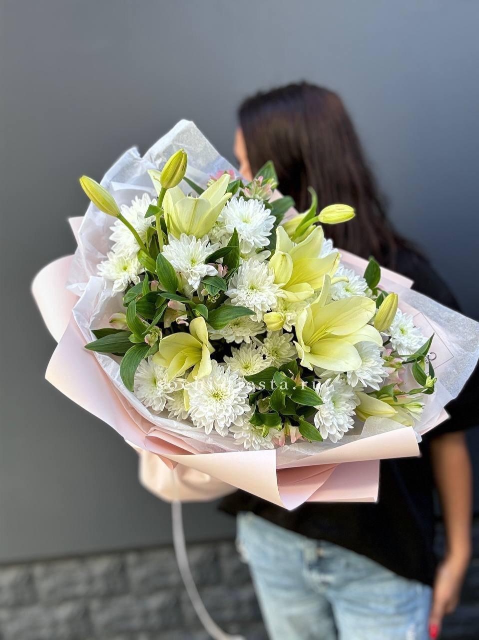 хризантема, лилия, альстромерия (возможна замена от сезона), упаковка.