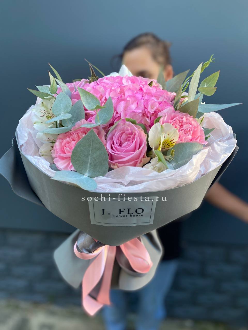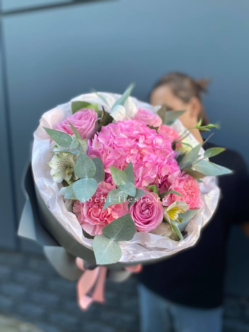 гортензия, кустовые розы, ковыль, диантус, эвкалипт, авторское оформление.
