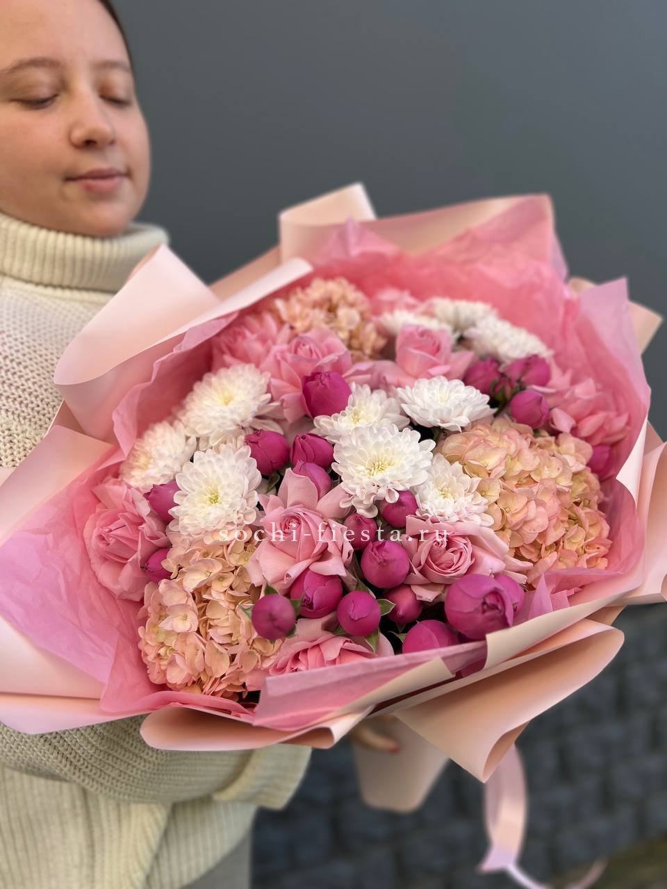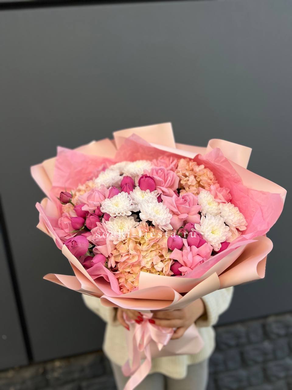 Пастельная гамма с лёгким касанием зимнего воздуха. Кустовые розы и диантус окружены воздушным ковылём, создавая мягкую текстуру с едва уловимой графикой. Гортензия добавляет объём, не перегружая силуэт.