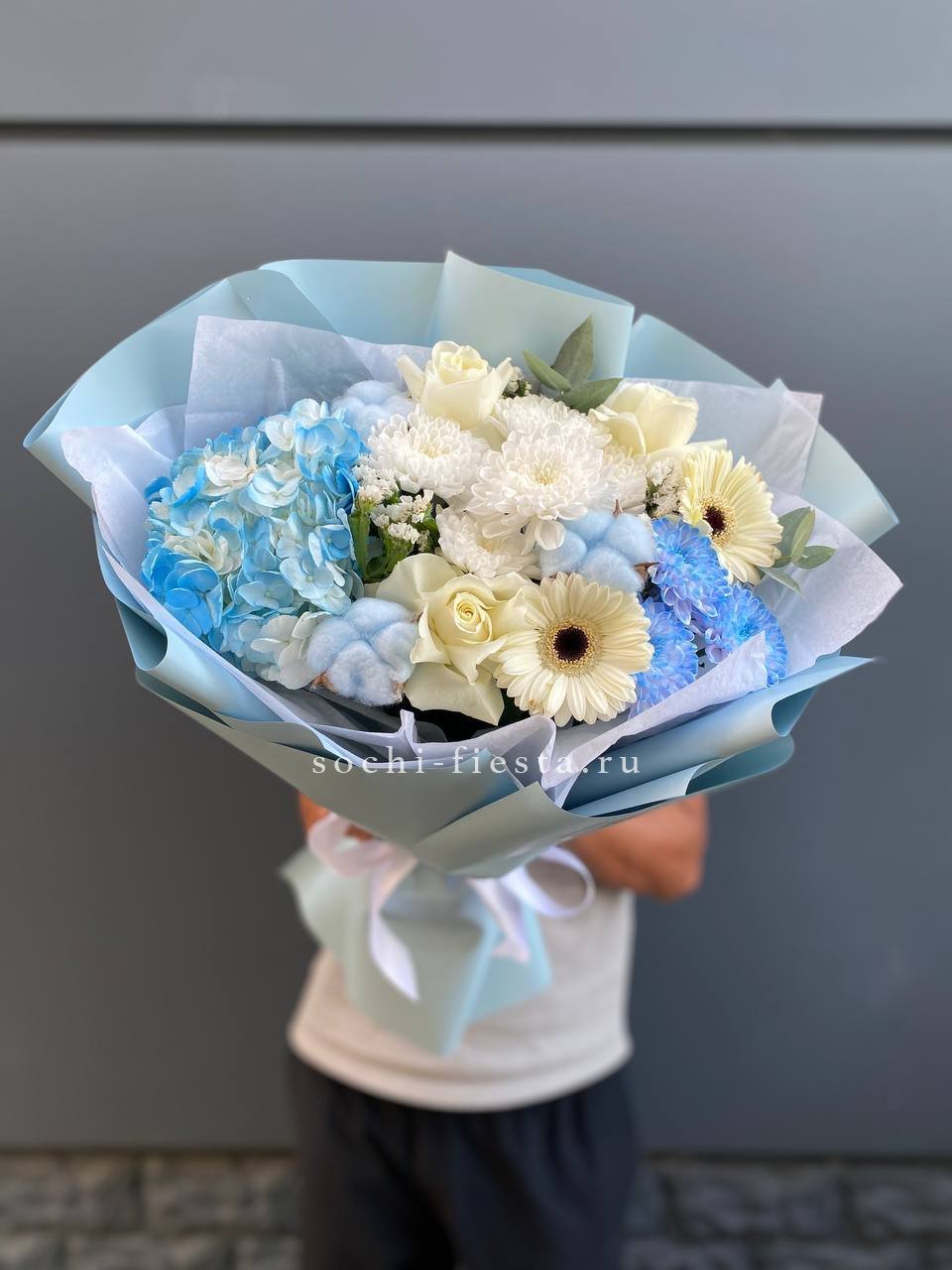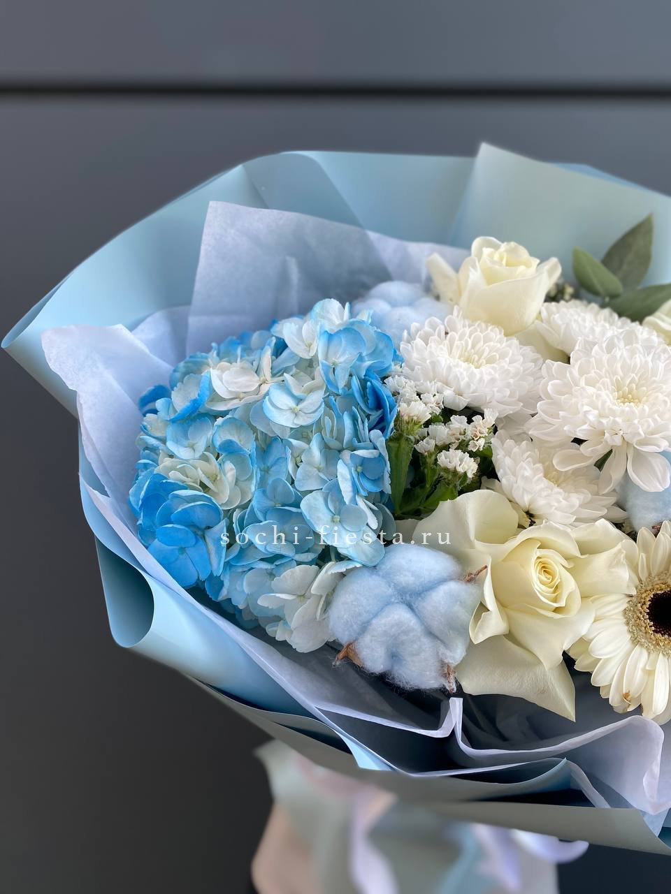 Белые французские розы переплетаются с пушистыми соцветиями маттиолы и хлопка. Гортензия и пионовидные бутоны создают объём, а ковыль вносит лёгкую небрежность в общий ритм.