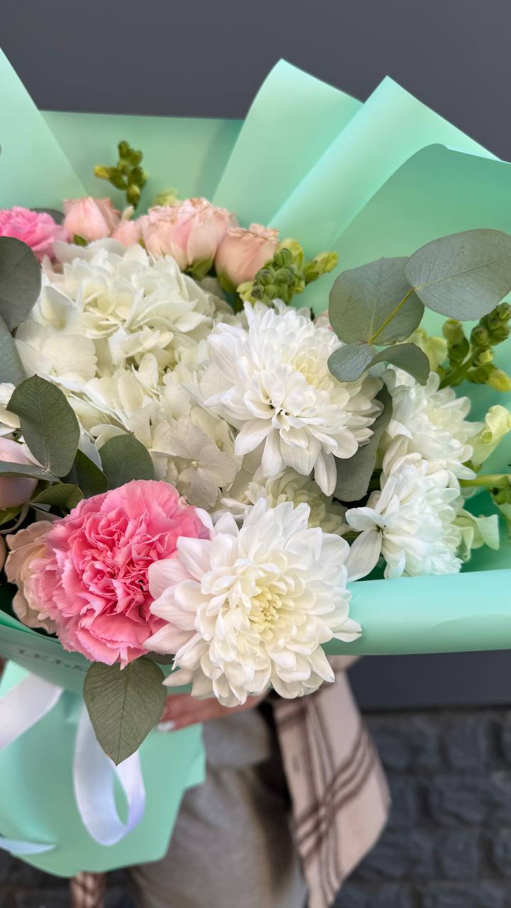 Белые шапки гортензии обрамляют пышные розы Мисти Бабблс с их узнаваемой многослойной структурой. Мягкая гамма и плавные переходы между соцветиями создают объёмную композицию спокойного звучания.