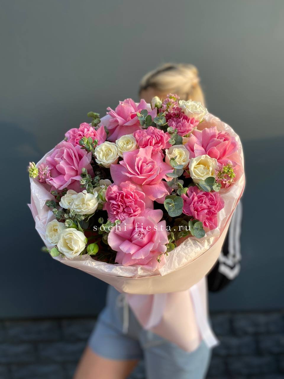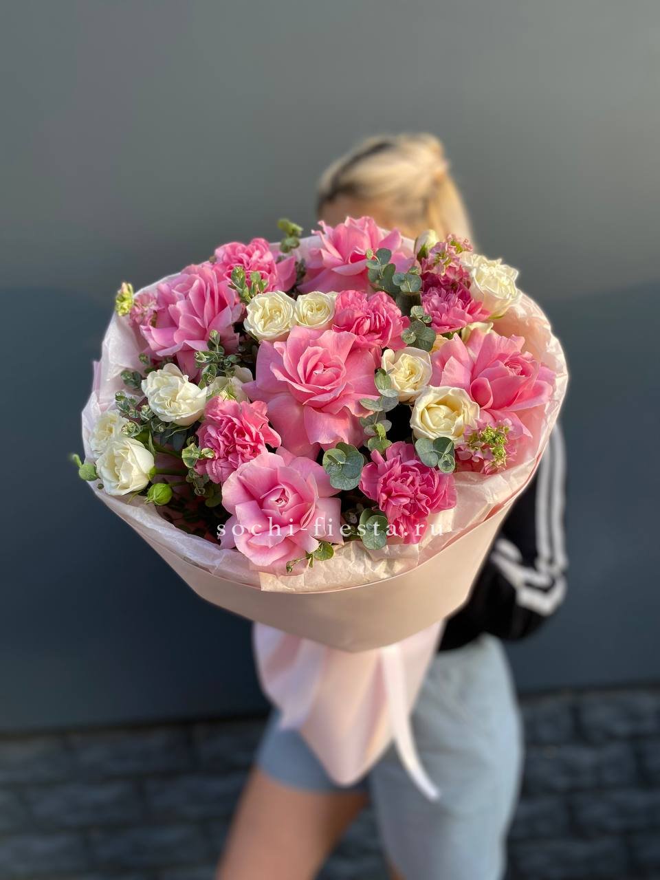 Розовые розы и диантусы окружены пышными соцветиями маттиолы и бомбастика. Композиция собрана плотно, каждый цветок поддерживает соседний, создавая объемную округлую форму. Букет держит силуэт и выглядит цельно с любого ракурса.