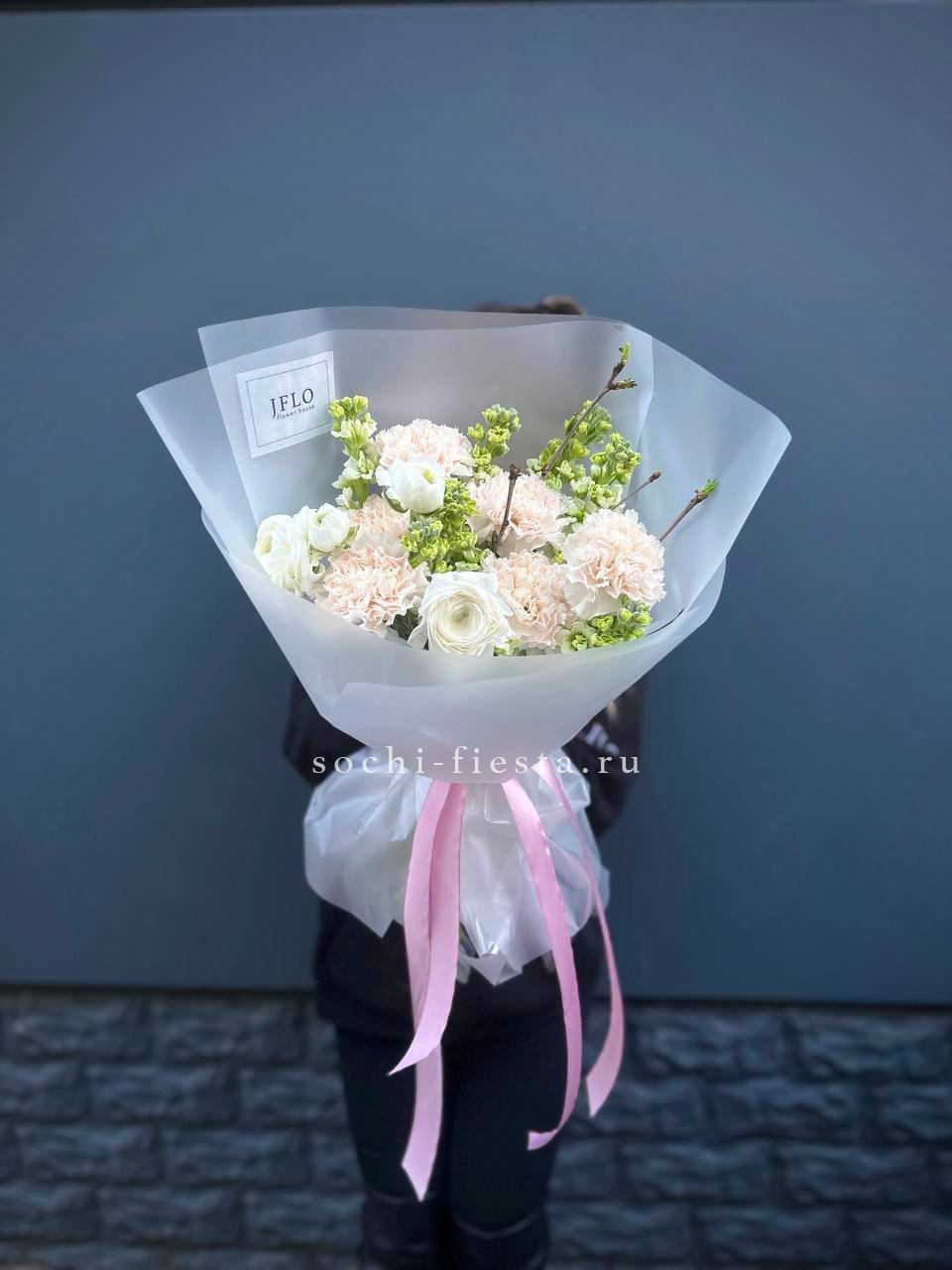 Душистая маттиола и многослойные ранункулюсы собраны в пышную композицию с цветущими ветками. Диантусы добавляют воздушности, а матовое оформление завершает образ.