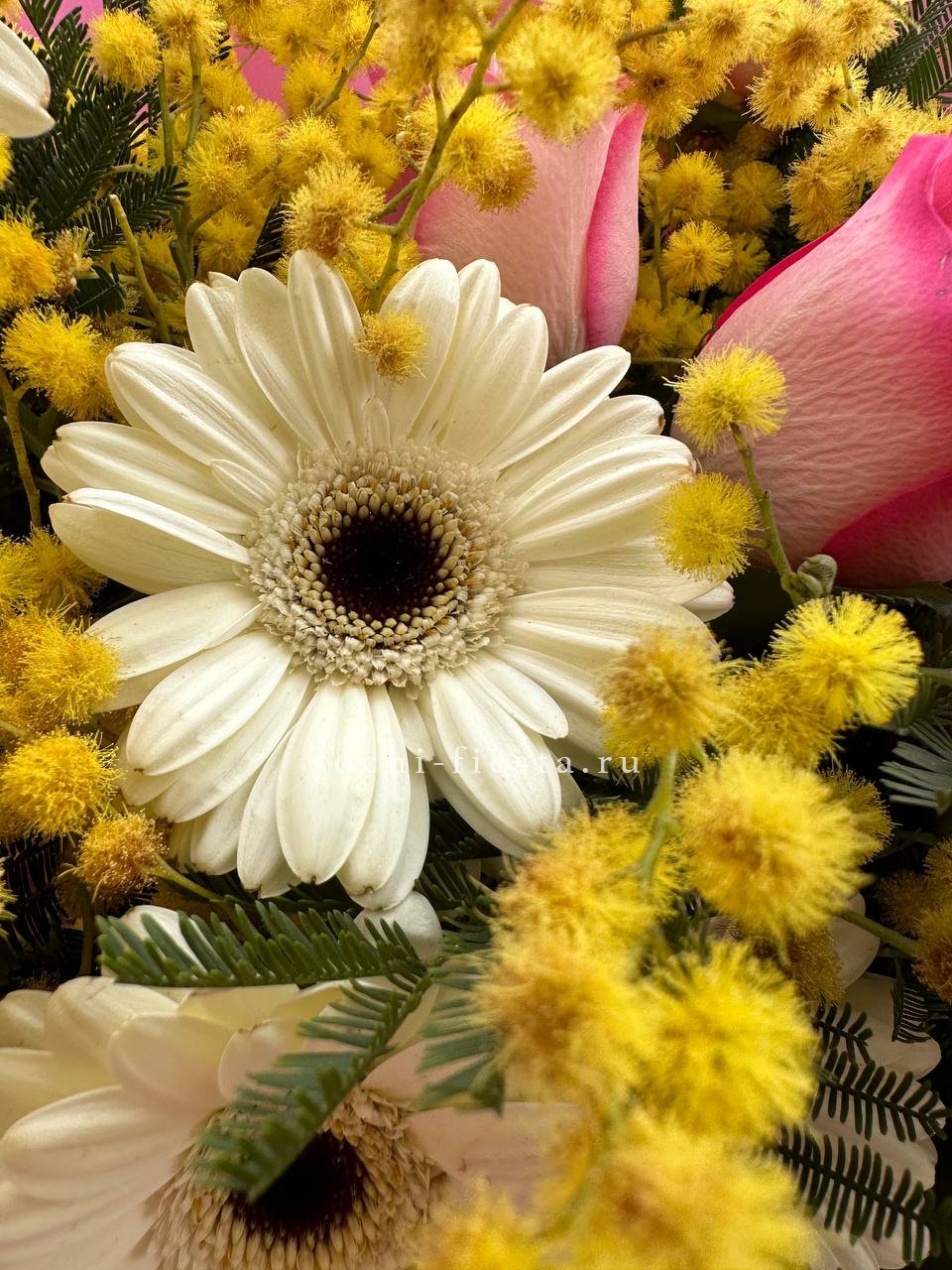 мимоза, герберы, розы Венди.