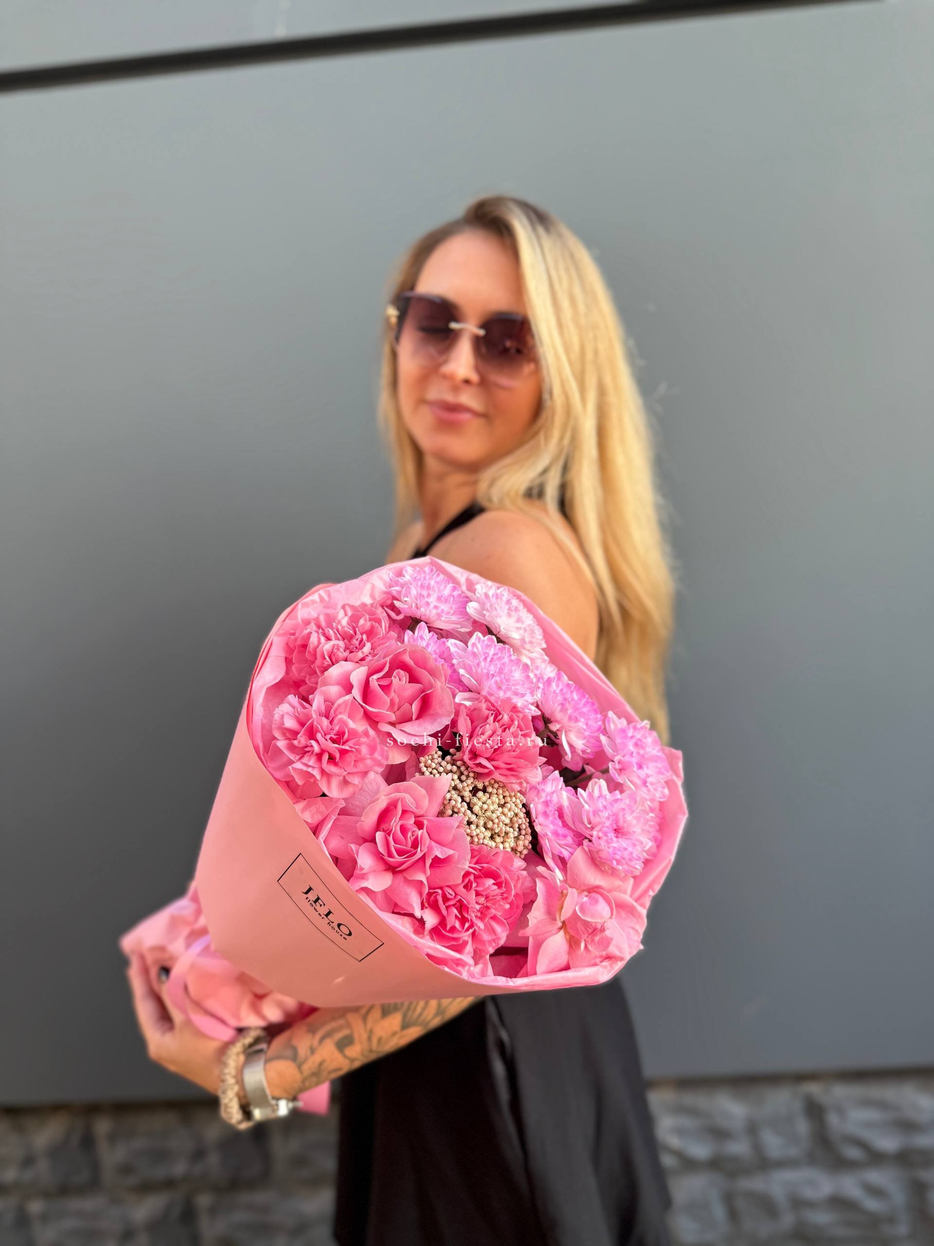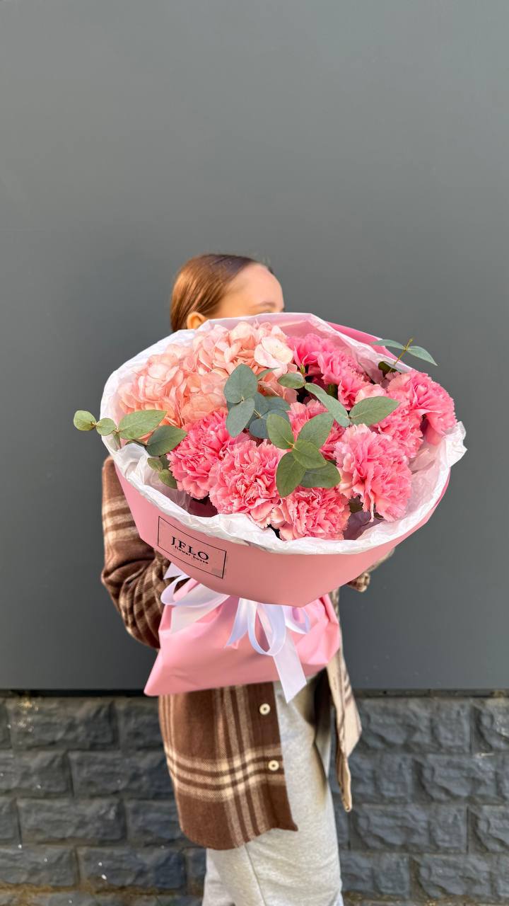 Гортензия формирует воздушную базу, сквозь которую проступают бутоны пионовидной кустовой розы и классических розовых соцветий. Хризантема добавляет графичности и удерживает форму без лишней массивности.