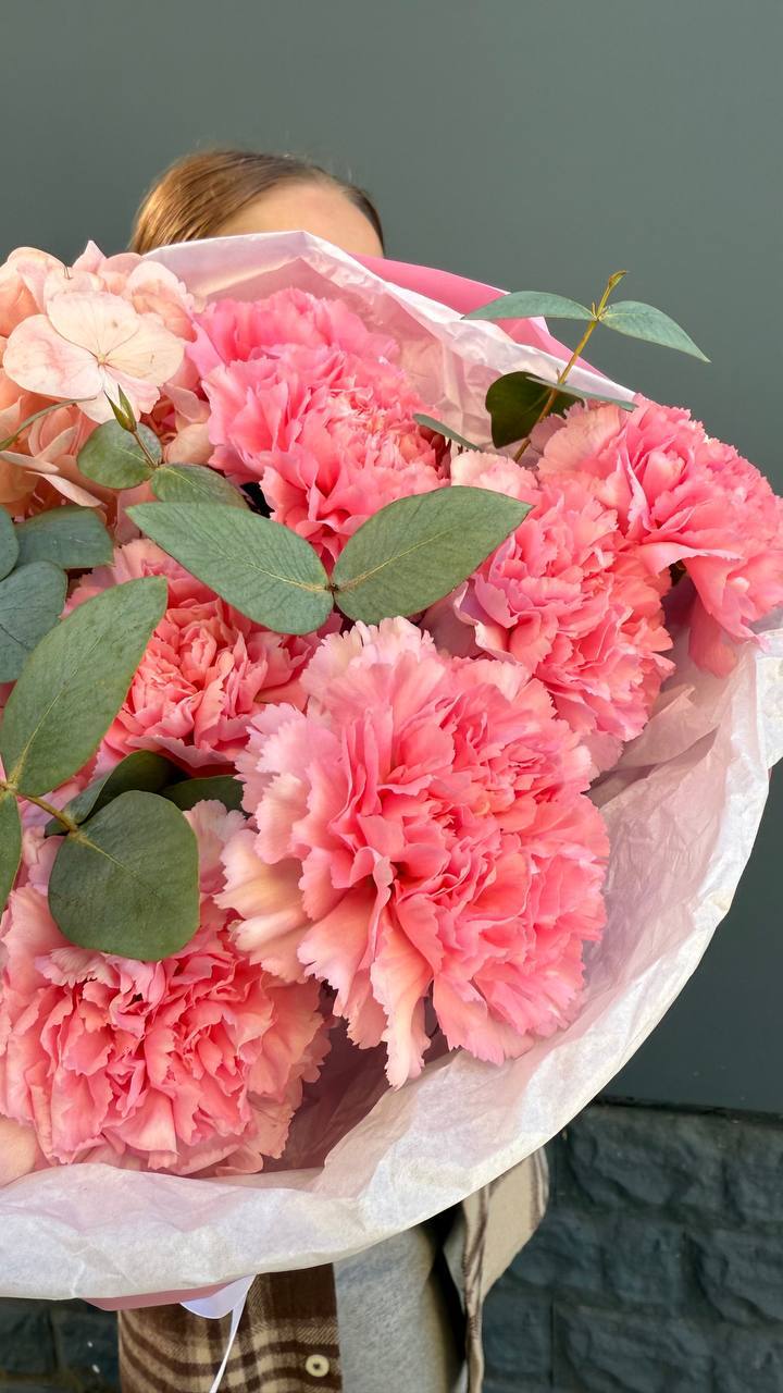 гортензия, пионовидная кустовая роза,  розовая роза, хризантема,  эвкалипт, лента, дизайнерская пленка.