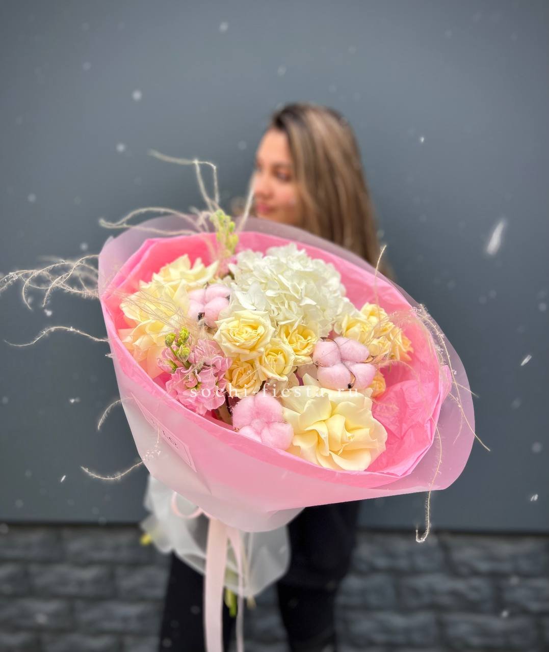 Пышная шапка из гортензии и пионовидных роз собрана с филигранной точностью. Диантус и эустома создают воздушные переходы между крупными соцветиями, а озотамнус добавляет графичные вертикали. Букет для тех, кто понимает язык авторской флористики.